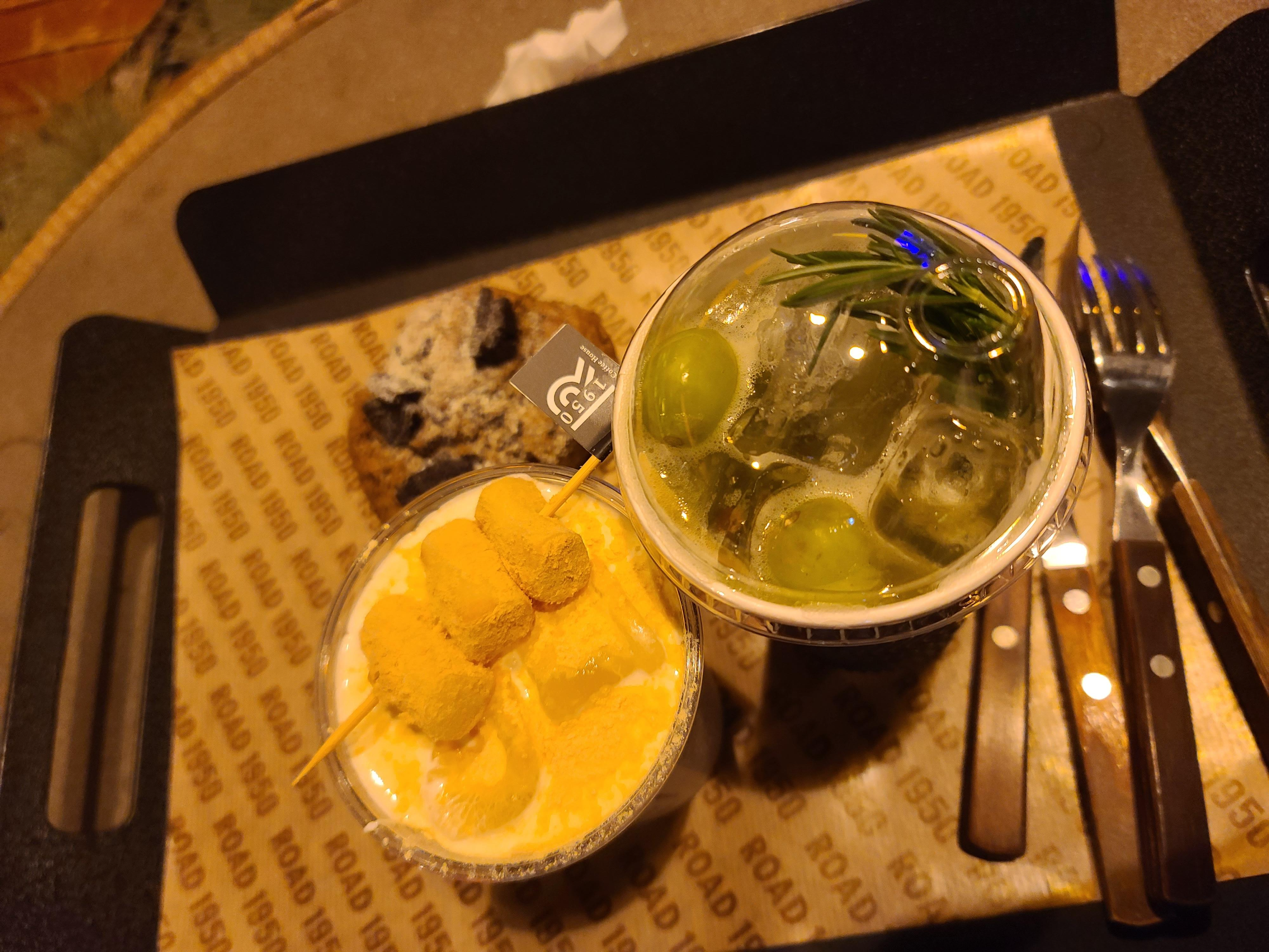 우리가 주문한 인절미라떼 청포도에이드 쿠앤크스콘