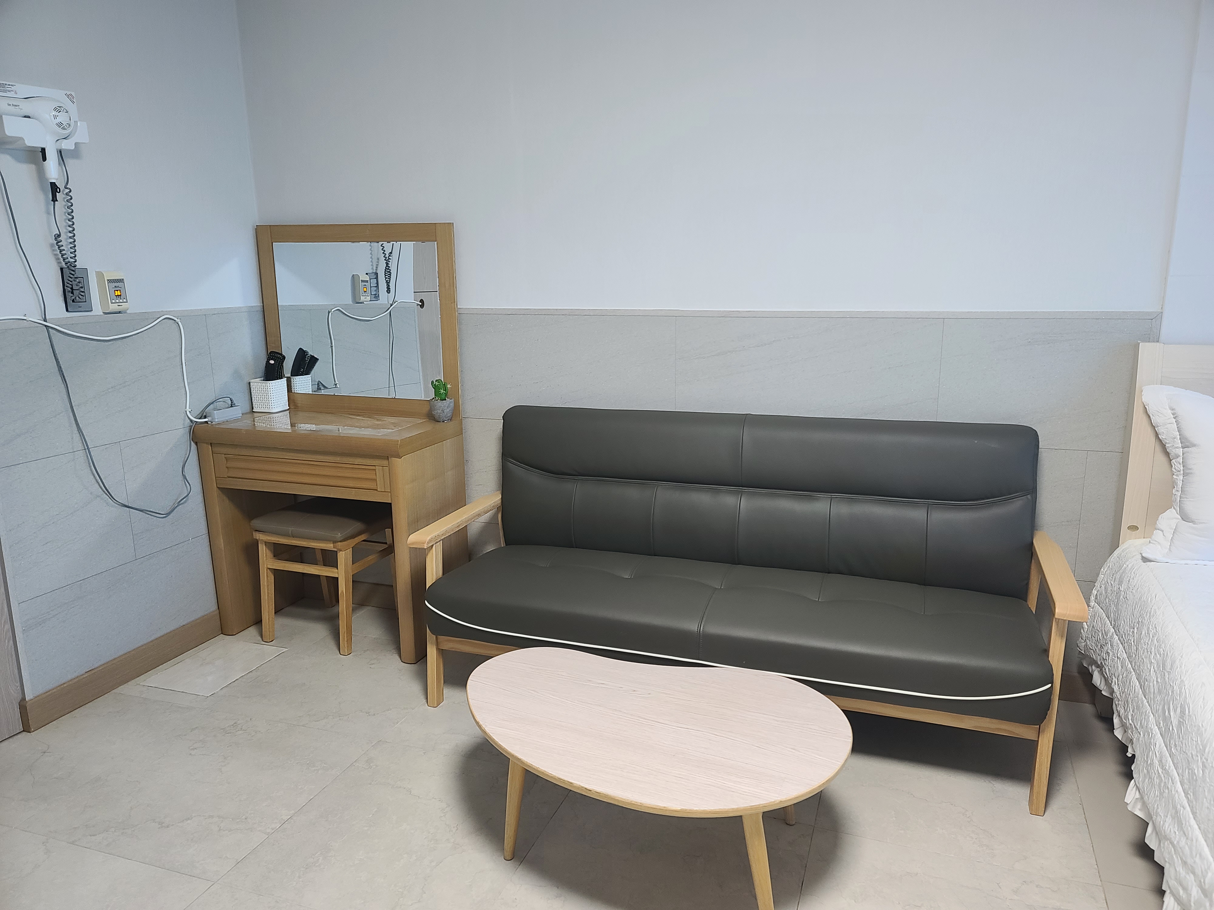 앉아서 티비 볼 수 있게 쇼파랑 간단한 식탁, 화장대도 있고