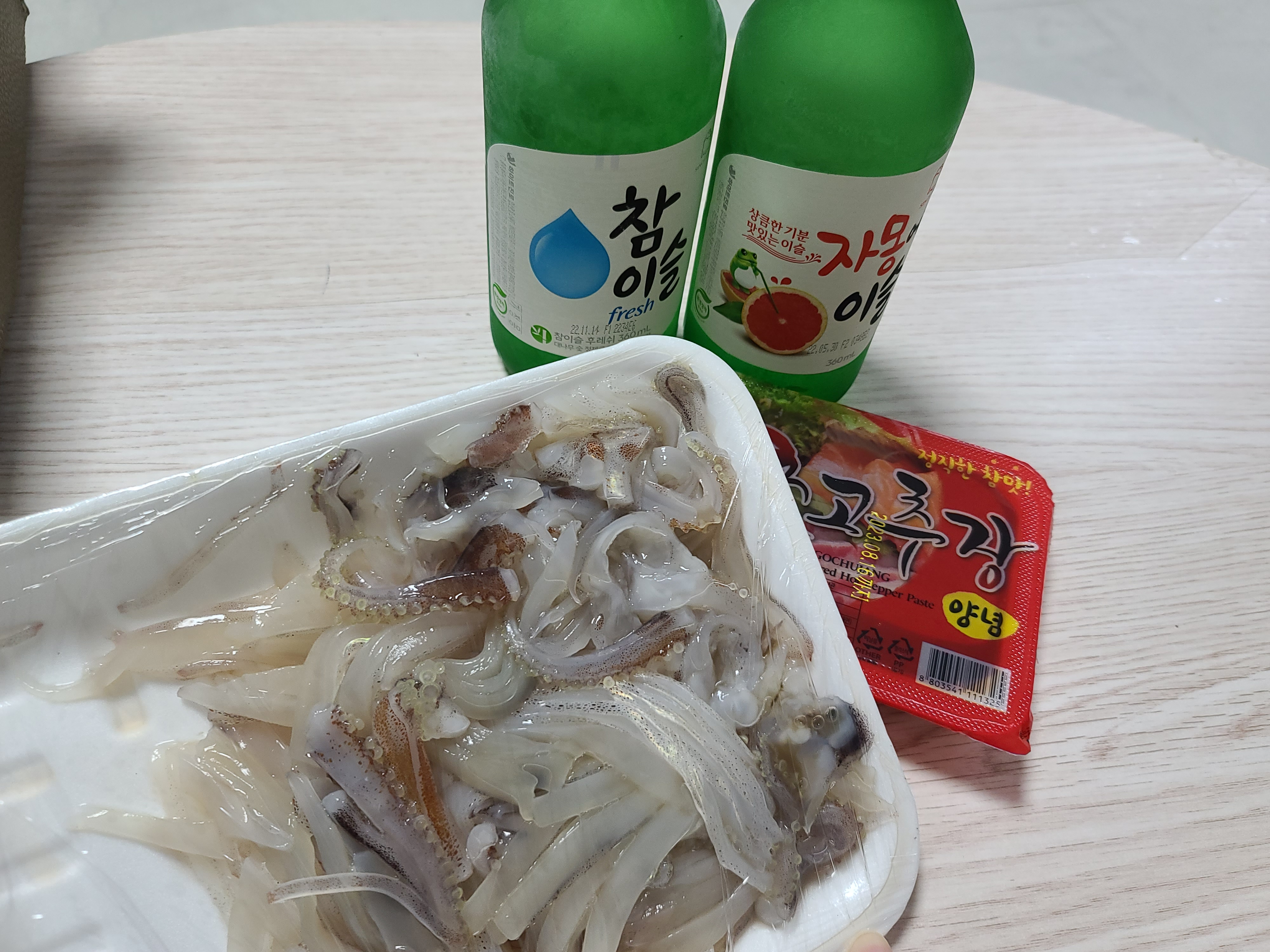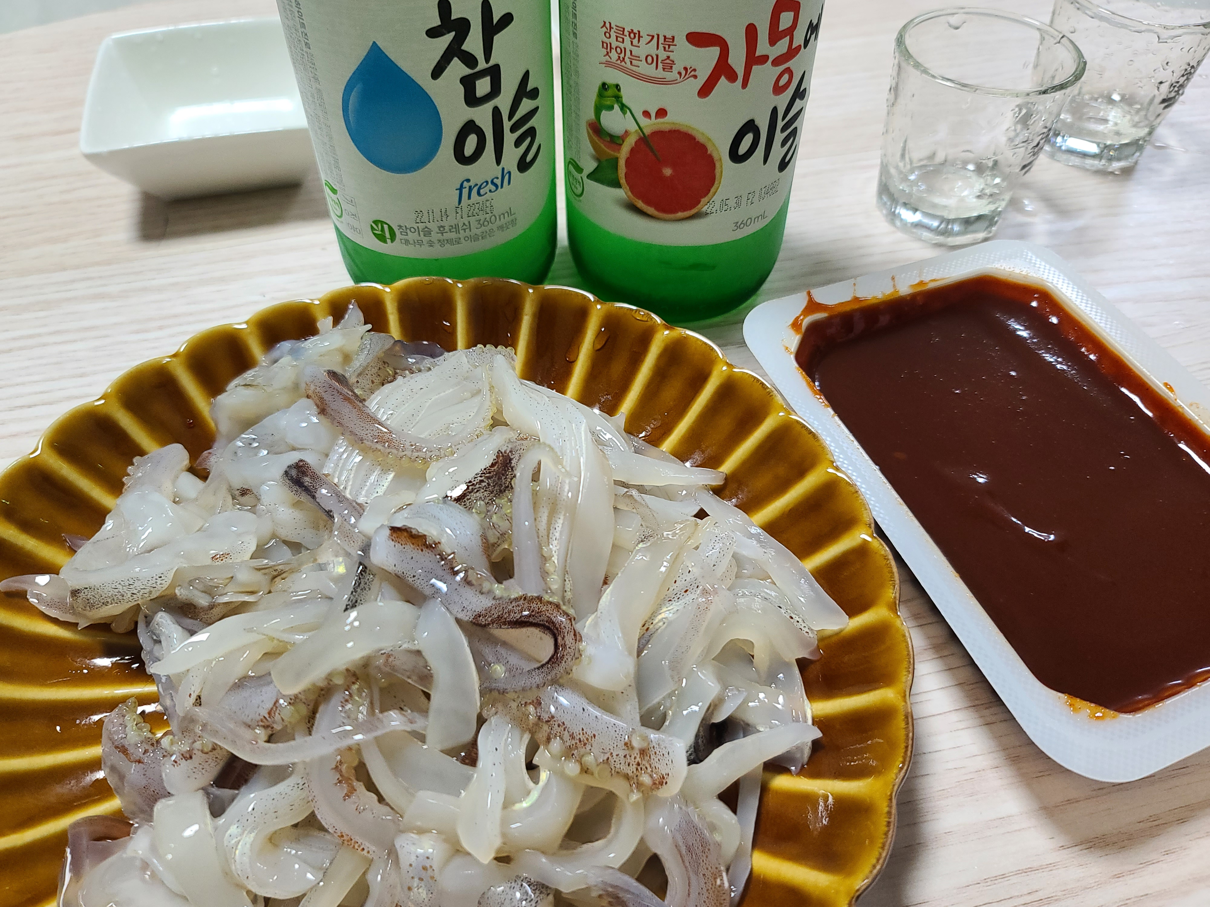 숙소로 돌아와서 오징어회를 초장에 찍어먹으면서 참이슬 짠~ 크!~