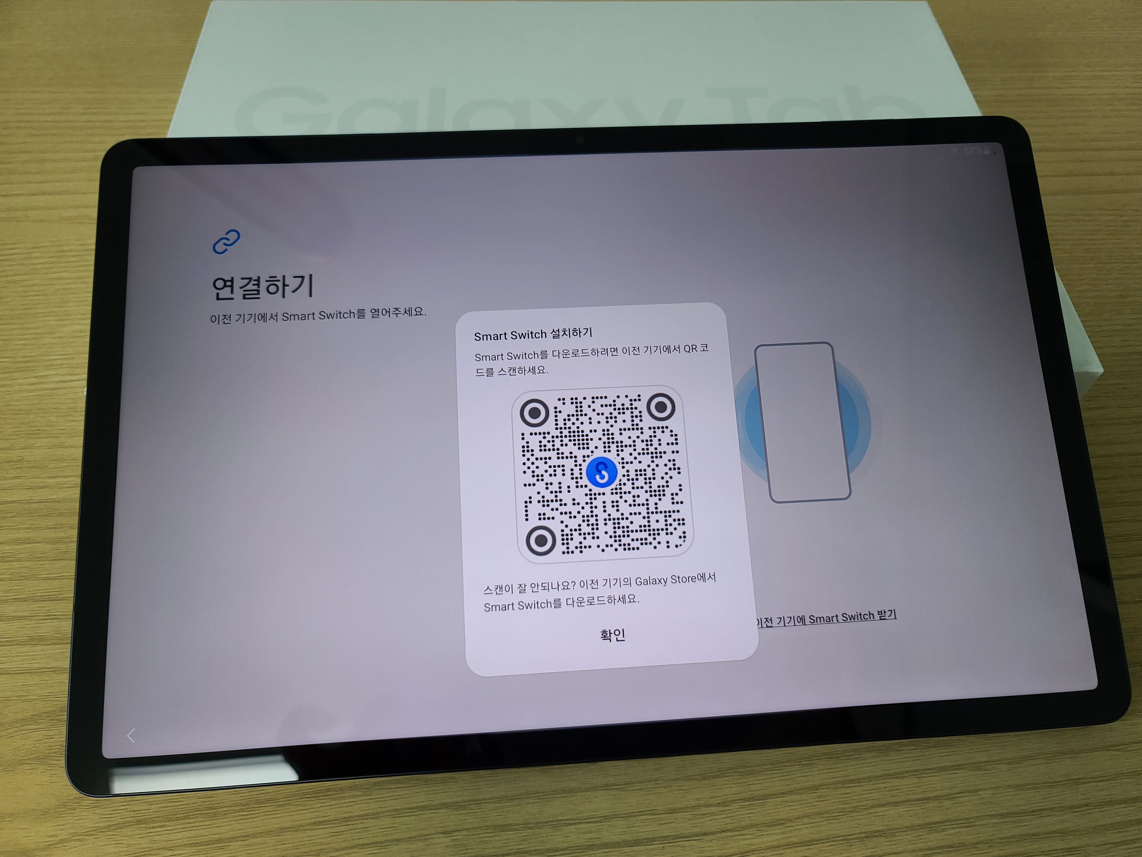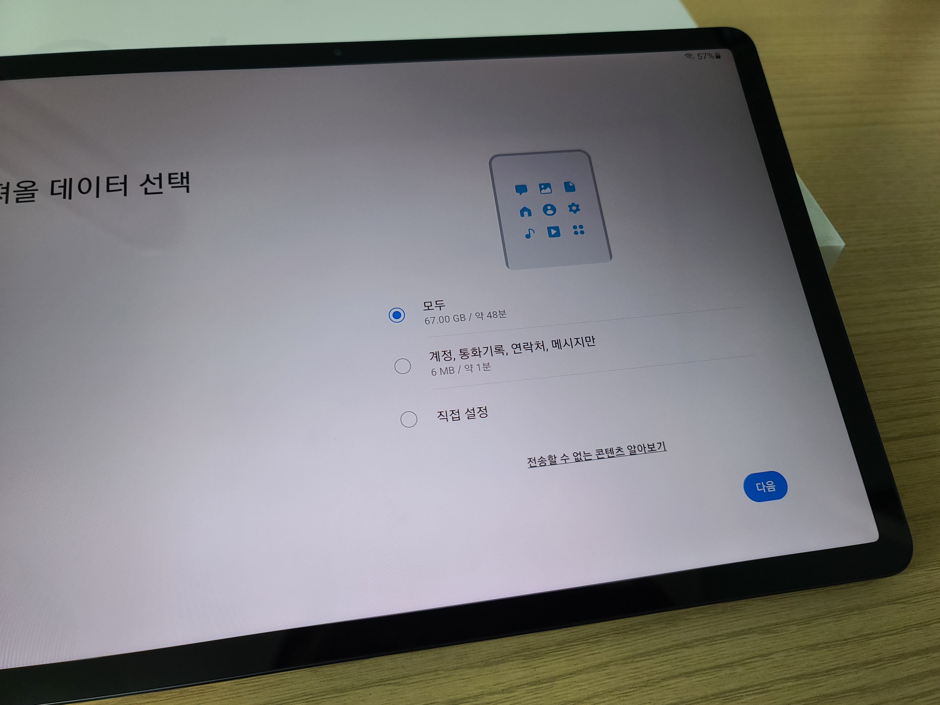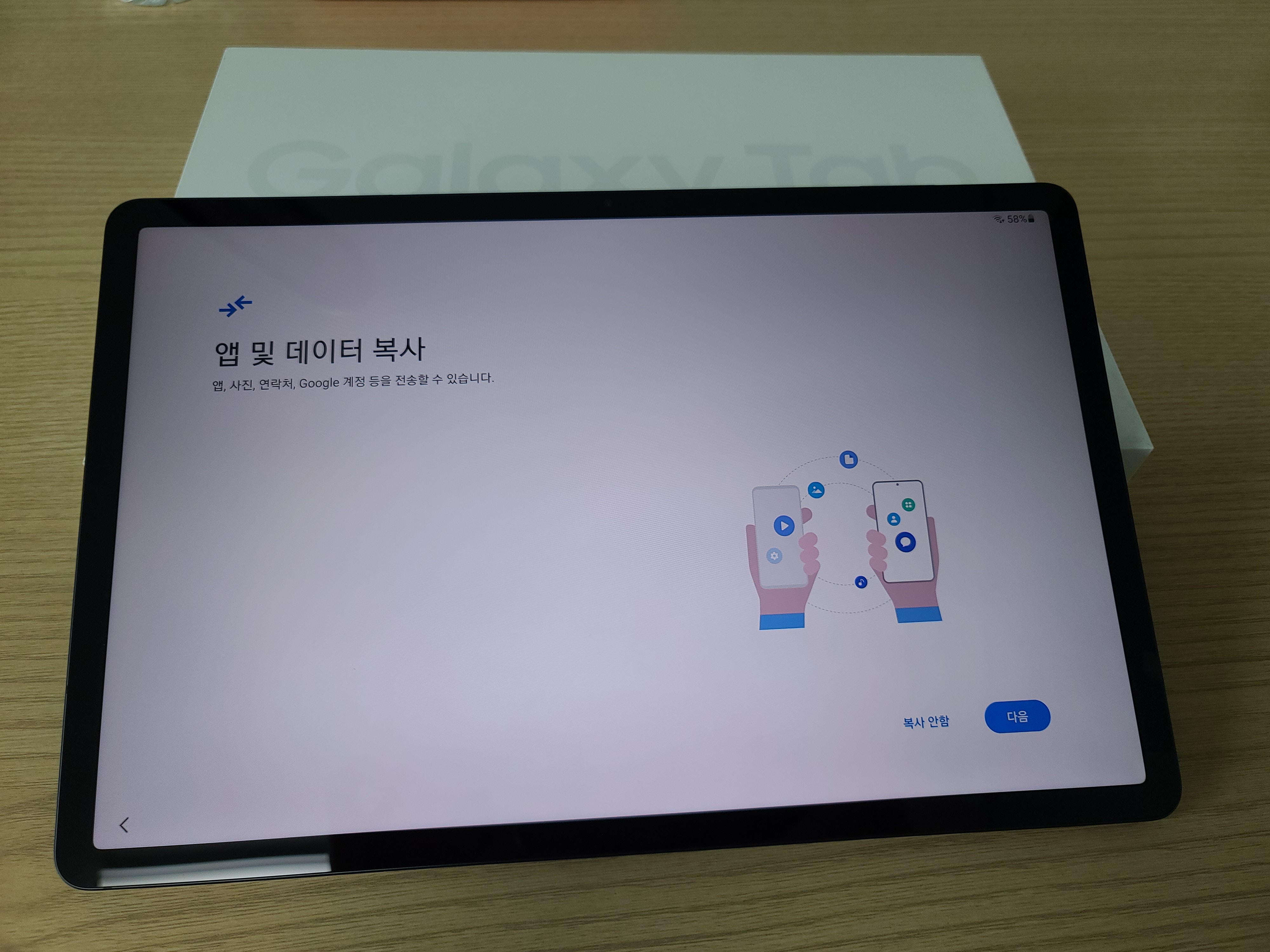 갤럭시 탭을 실행하면 그냥 전원만 켜서 새로 세팅할 수 있는데, 나는 핸드폰이 갤럭시인 관계로 각종 자료 연동이 가능했다.