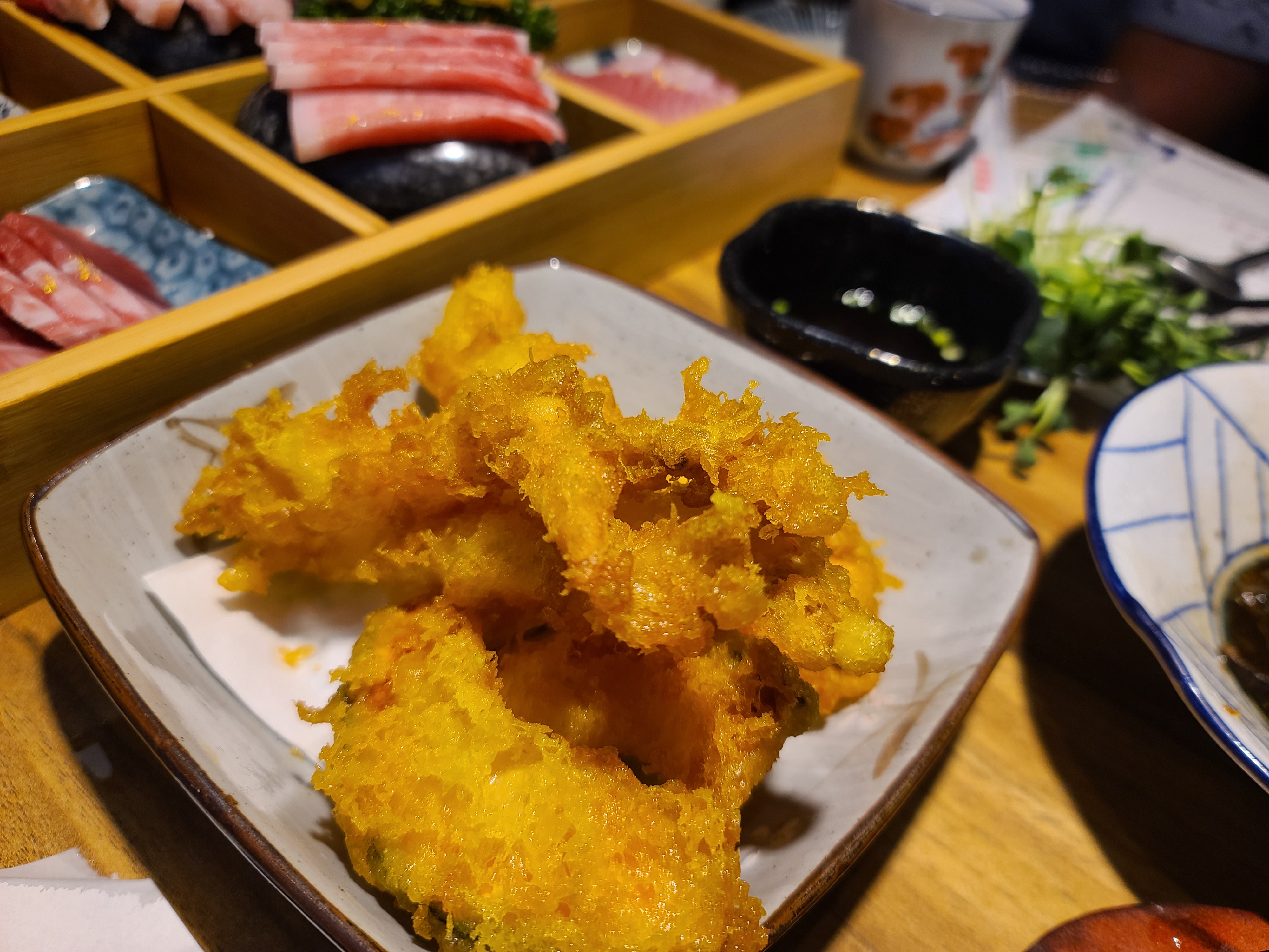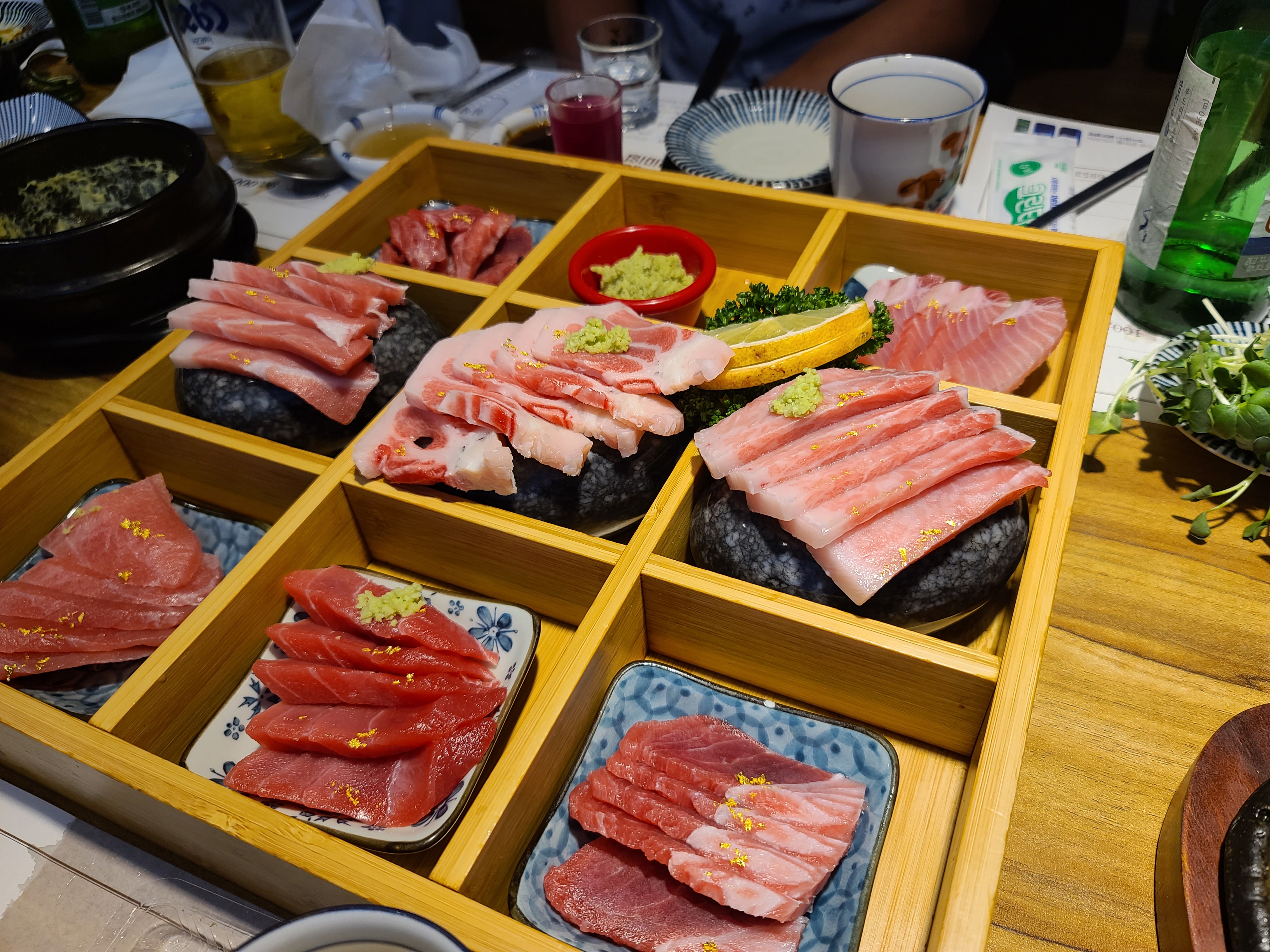 참치위에 와사비를 올려서 먹어야 배가 빨리 안 부르다고 해서 야무지게 올려 먹었다.