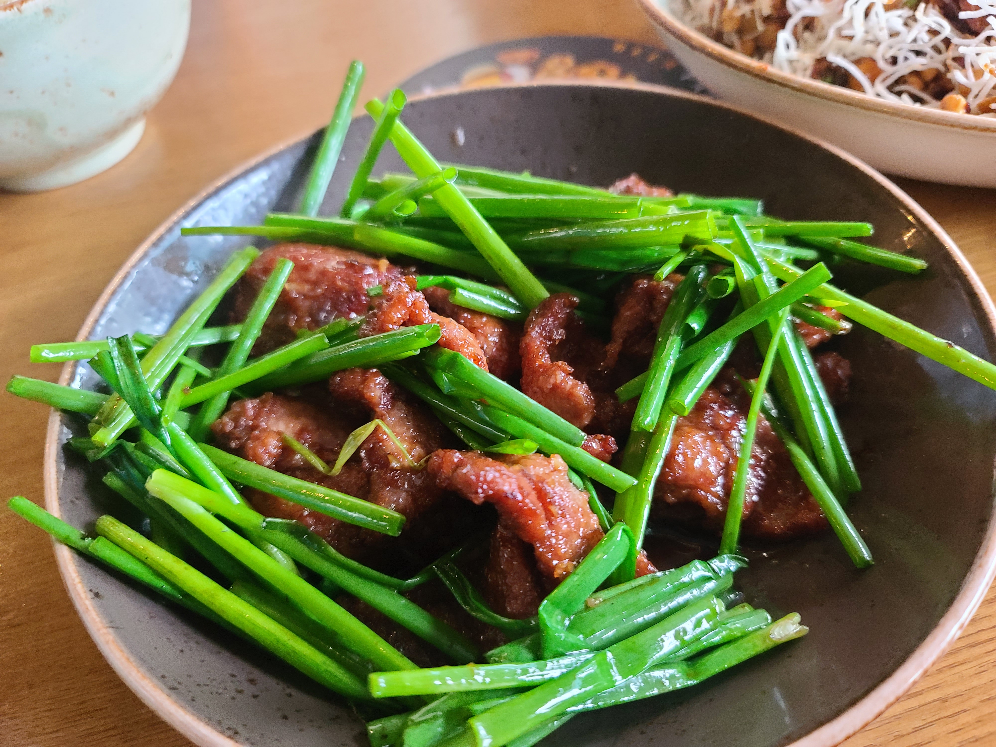 양배추에 양념이 된 닭고기와 튀긴 라이스 스틱을 함께 싸서 먹는 요리.