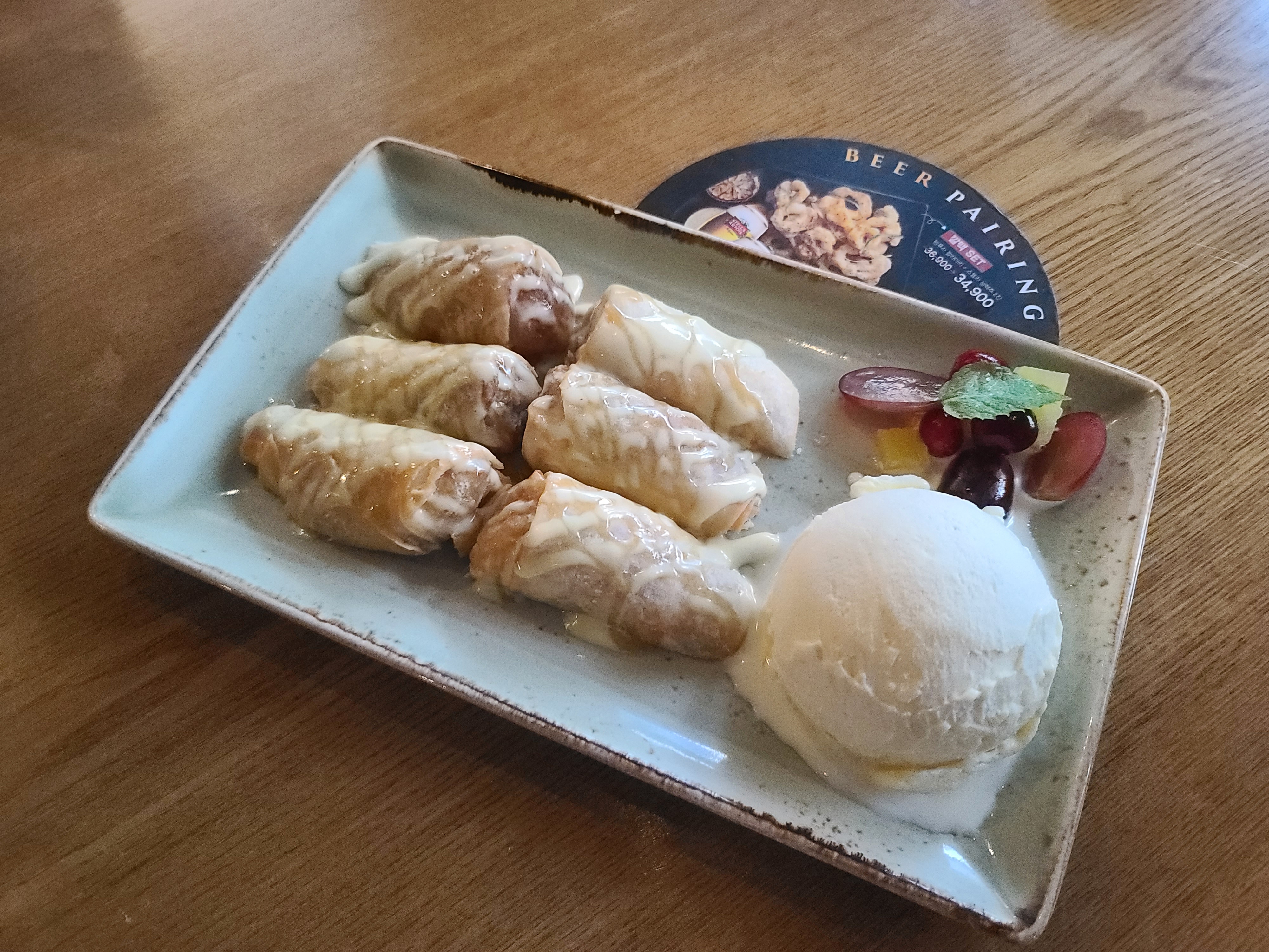 바나나롤은 무슨 맛일까 했는데 바나나를 익혀서 물컹한 식감을 스프링롤이 바삭하게 해주고 달다구리~한 맛에 아이스크림까지 추가해서 생각보다 맛있었음
