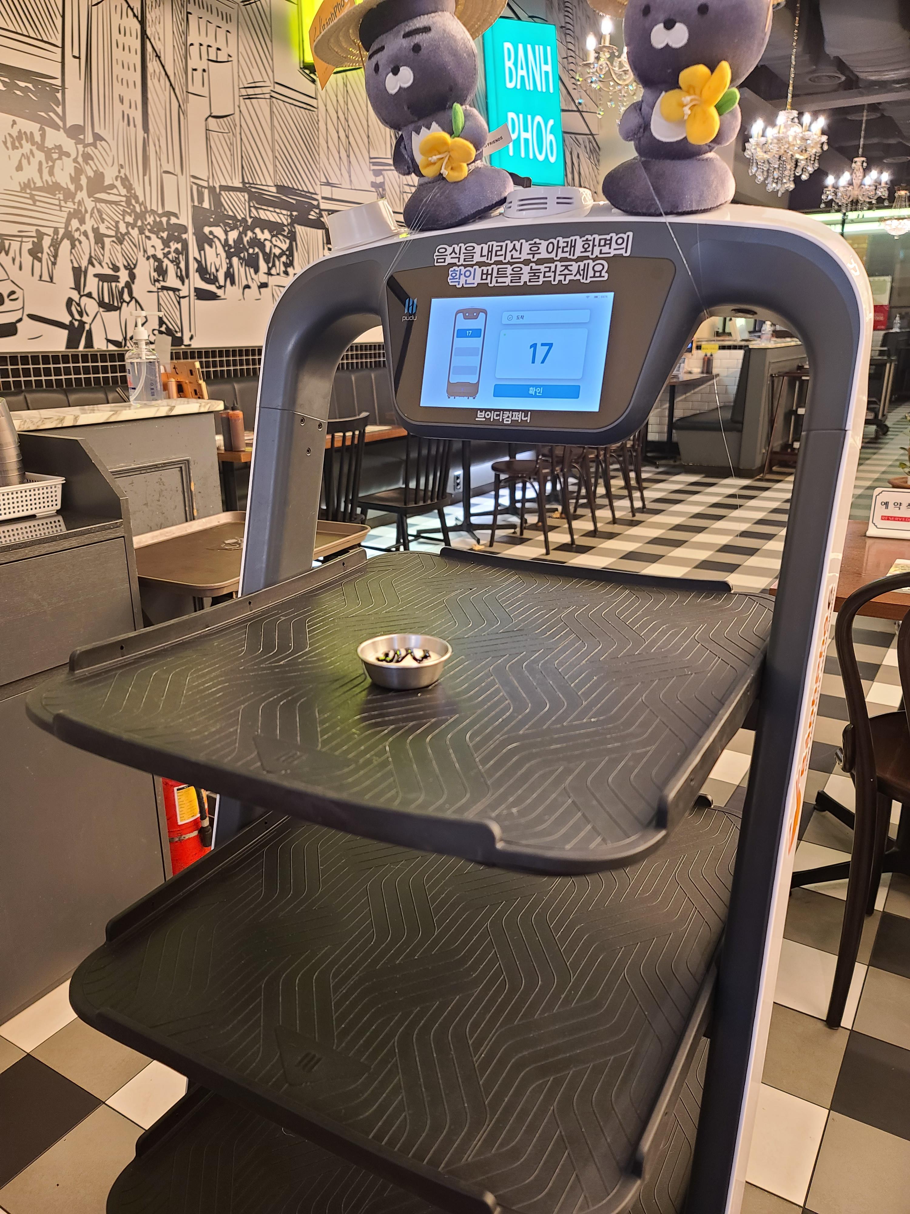 요즘 식당 곳곳에서 서빙기계를 도입했는데 반포식스에도 물이랑 반찬은 기계가 갖다줬다.