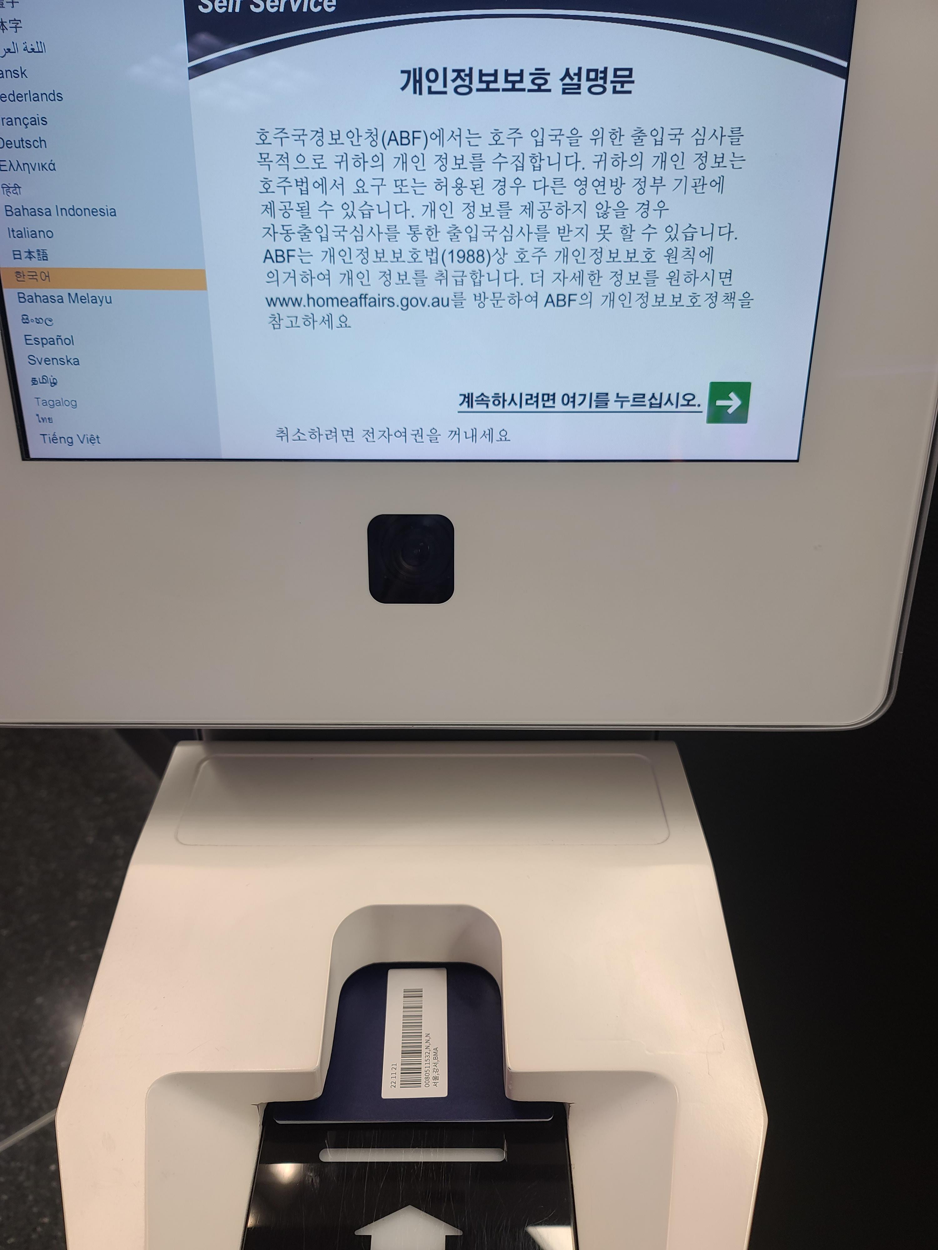 한국 여권 넣었더니 한국어로 바로 안내 됨.