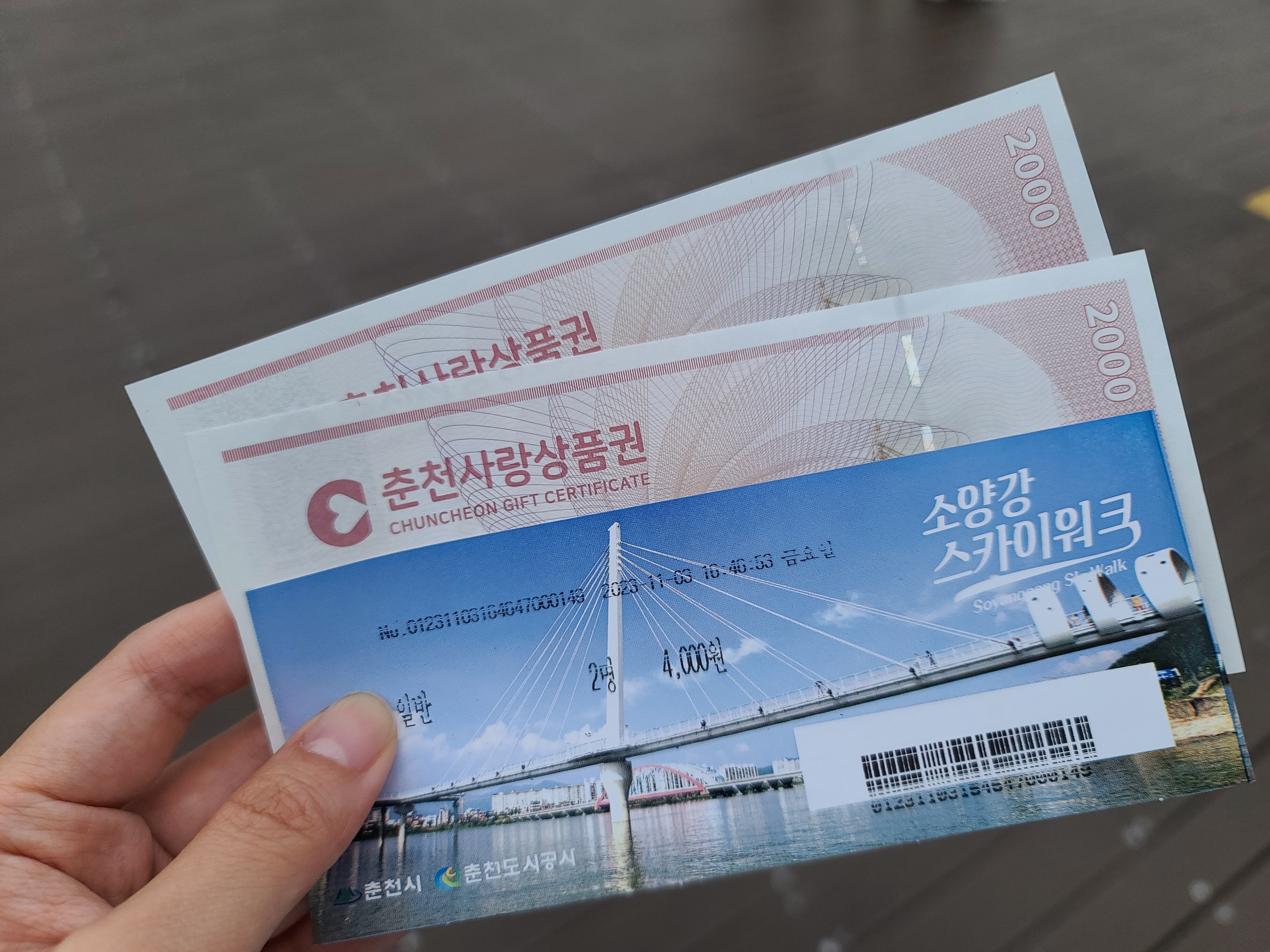 스카이워크 입장료는 \2,000/1인 인데 구매한만큼 춘천사랑상품권으로 돌려줘서 사실은 무료나 마찬가지