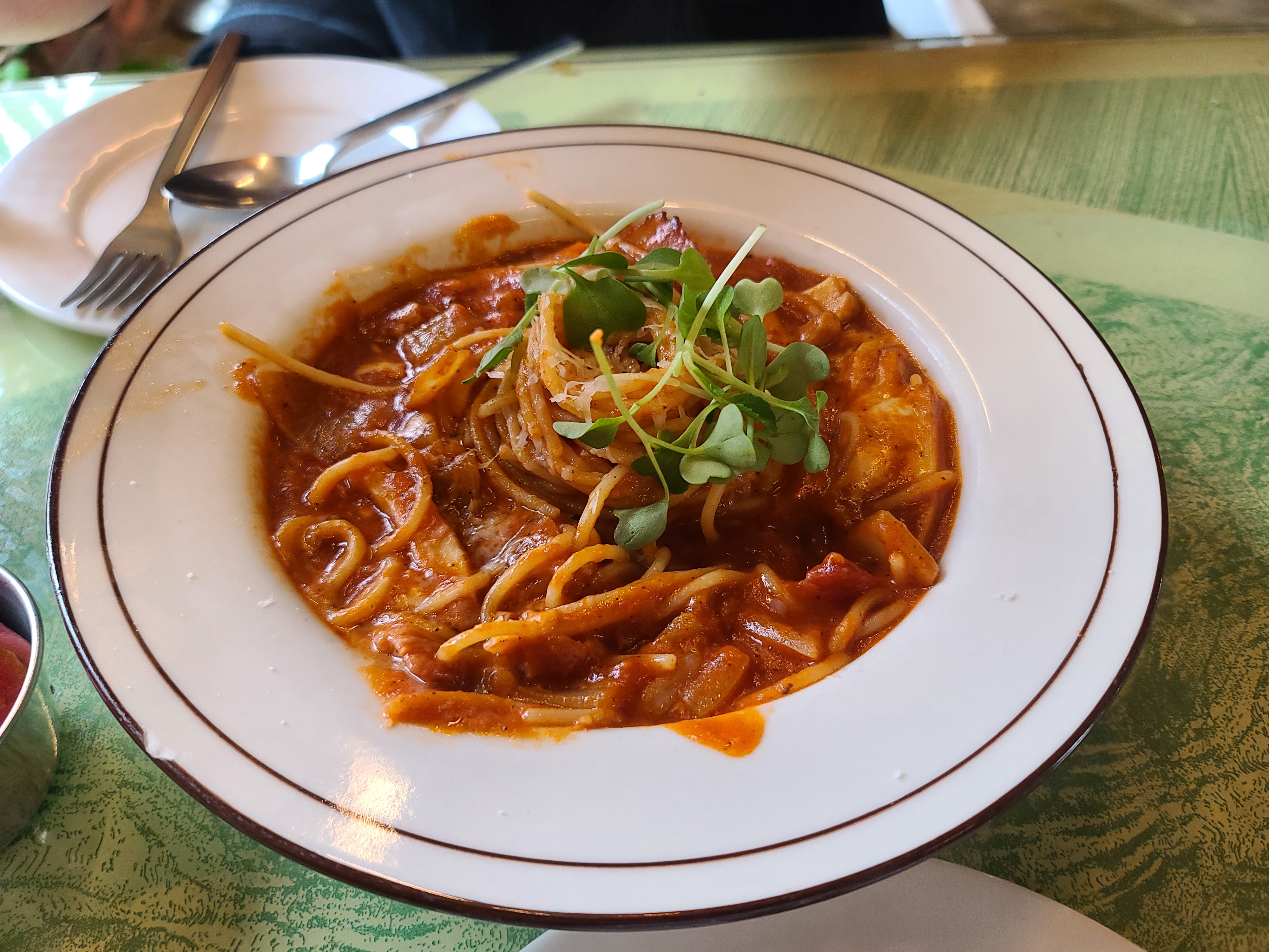 뭔가 뚝배기를 기대했는데 일반 파스타 접시라서 살짝 놀랐지만 토마토에 가득 들어있는 치즈와 살짝익혀서 부드러운 식감의 베이컨이 진짜 환상이었음.