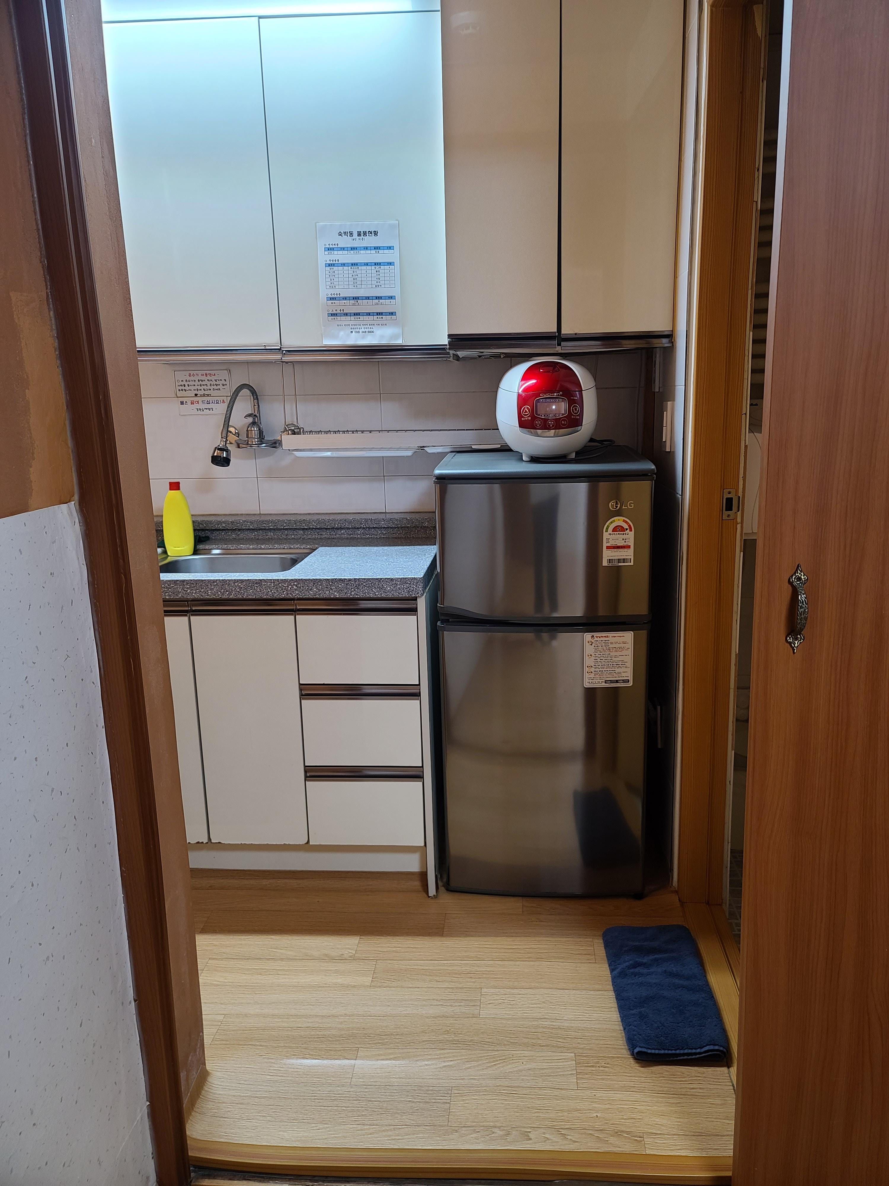 주방에 나름 싱크대, 냉장고도 사이즈가 큰거였고 밥솥도 있었다.