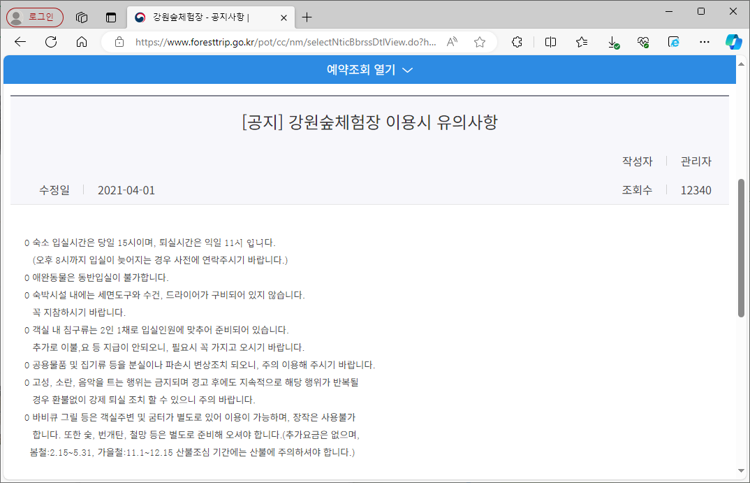 17 2019.12 강원숲체험장 이용시 유의사항 0 숙소 입실시간은 당일 15시이며, 퇴실시간은 익일 11시 입니다. (오후 8시까지 입실이 늦어지는 경우 사전에 연락주시기 바랍니다.)0 애완동물은 동반