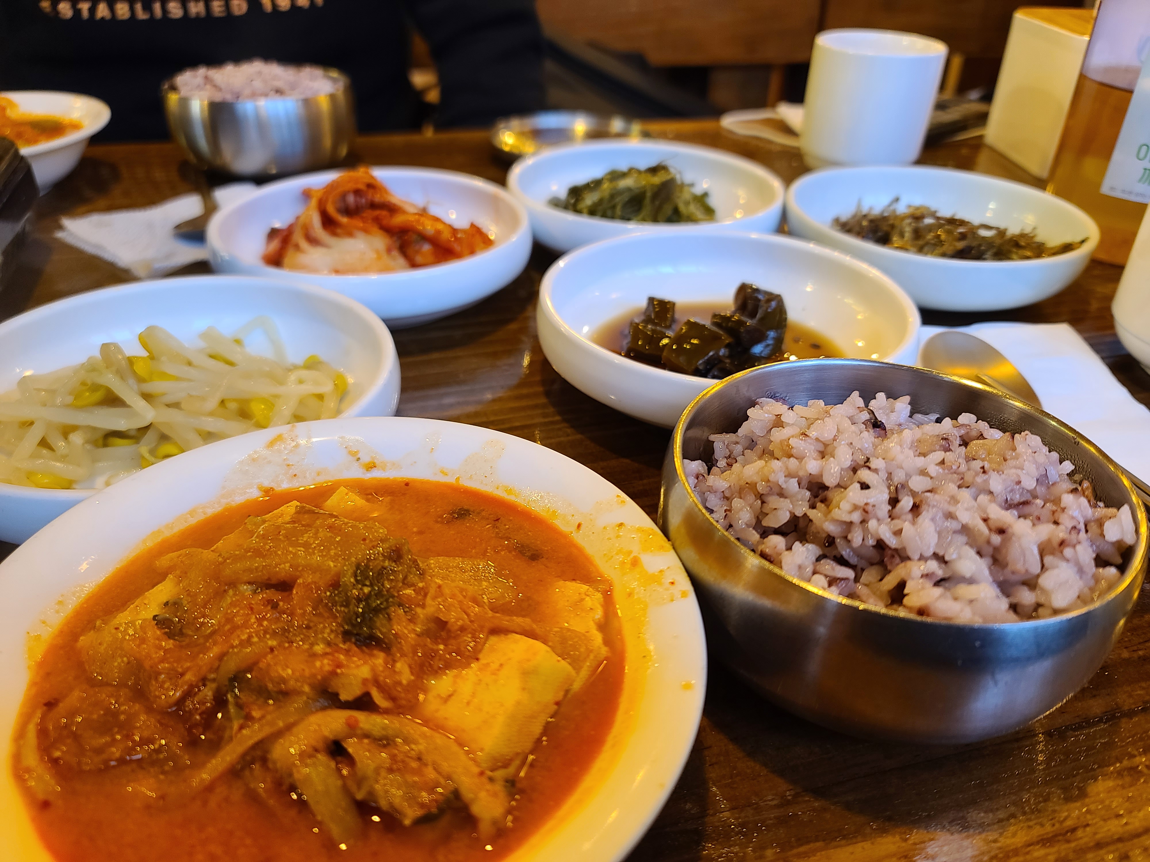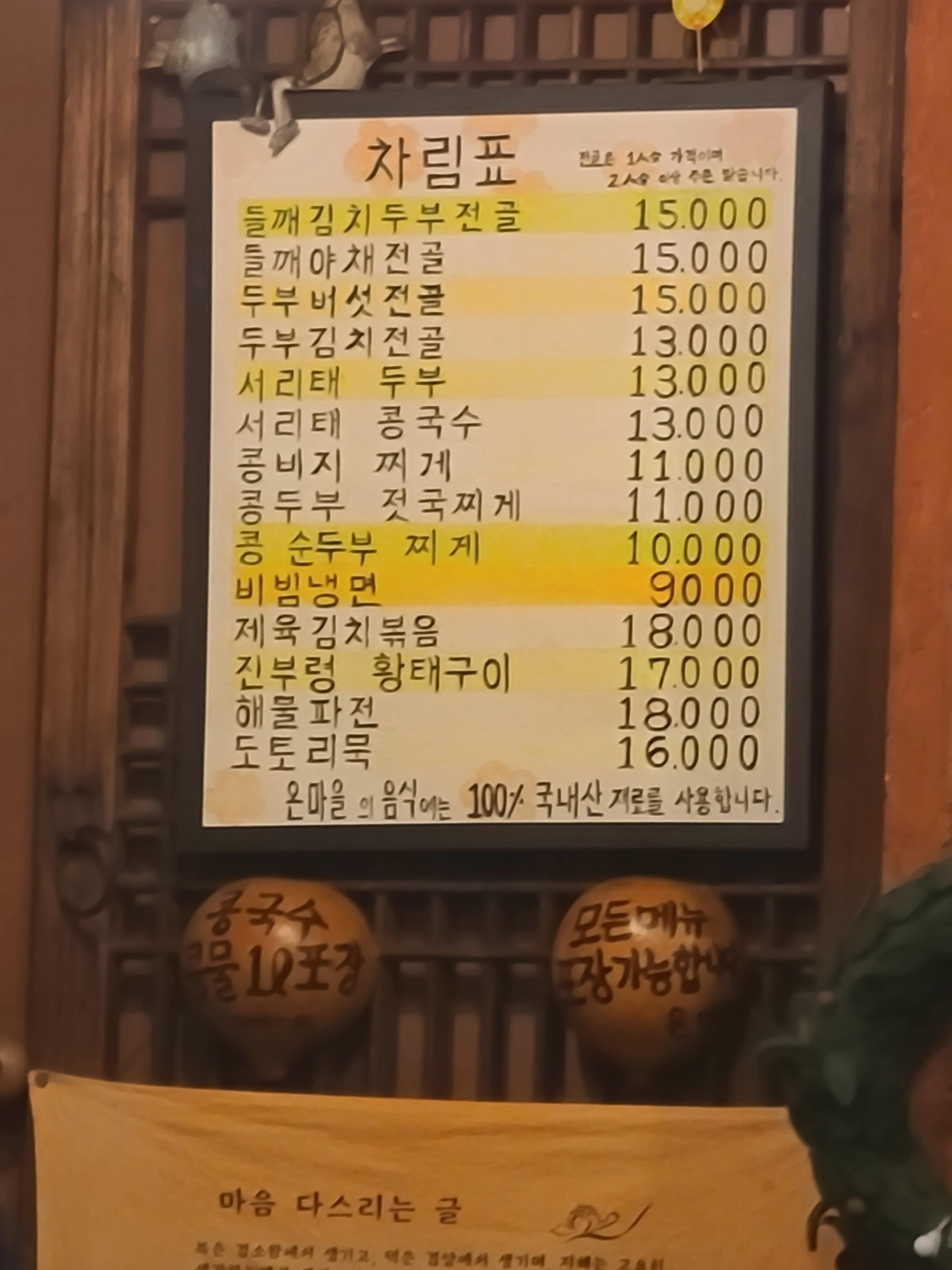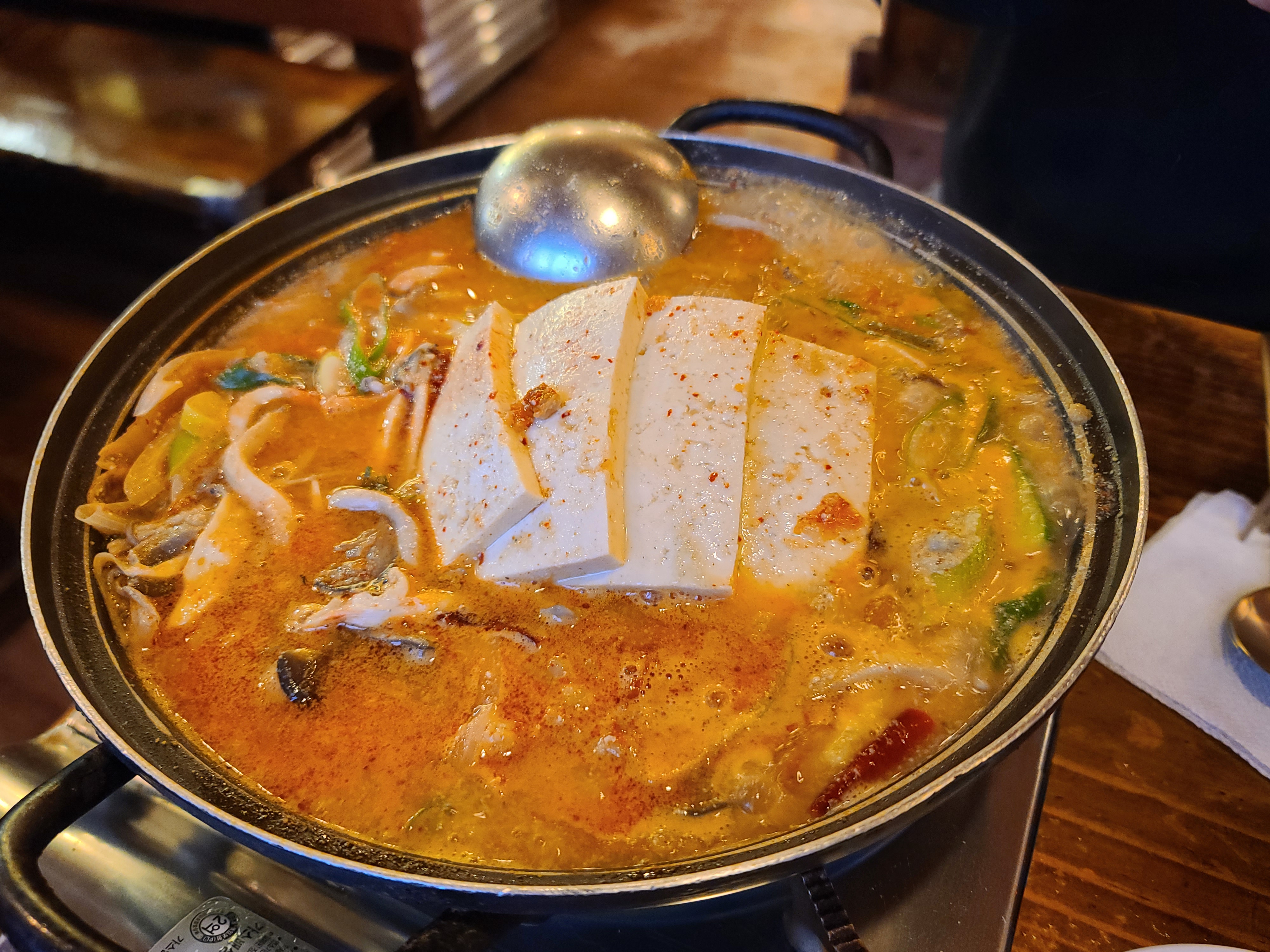 그런데 1월 1일이라 문을 연곳이 많이 없었고 + 산행을 하면서 추위를 탔던 우리는 따뜻한 음식이 먹고 싶어서 근처 두부전골을 파는 온마을이라는 식당으로 갔다.