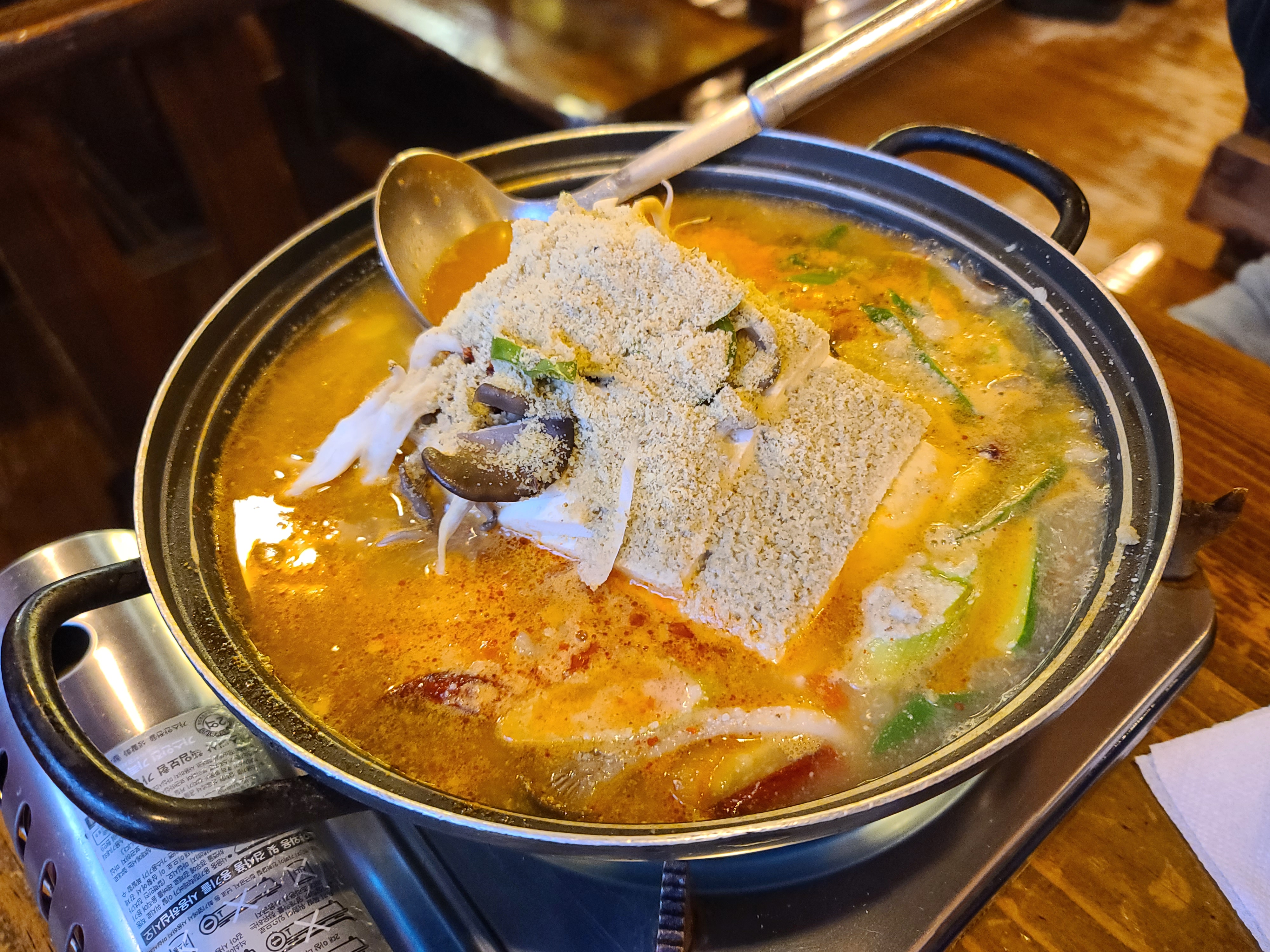 들깨 솔솔 올라간 뽀얀 두부전골에 신김치를 팍팍 넣어준 요리였다.