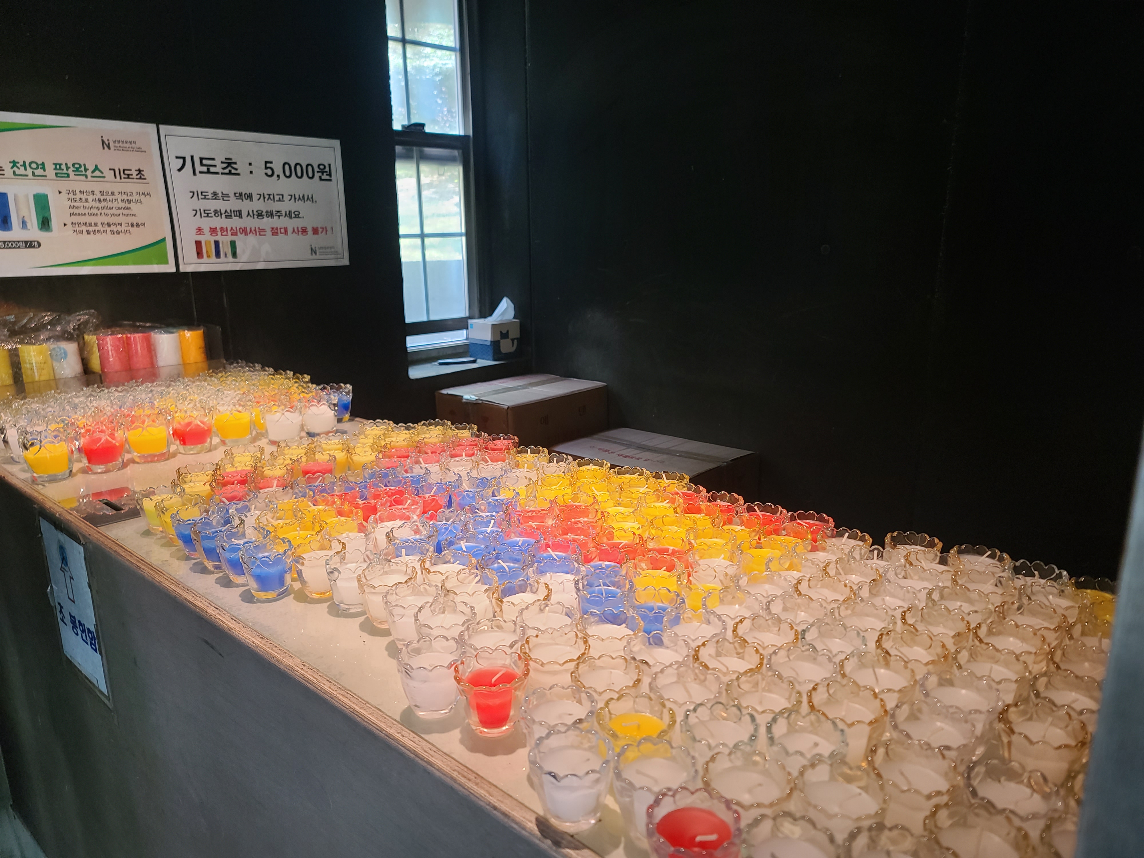 색깔별로 있어서 원하는 색 초를 골라 불을 올리고 기도 하는 시간.