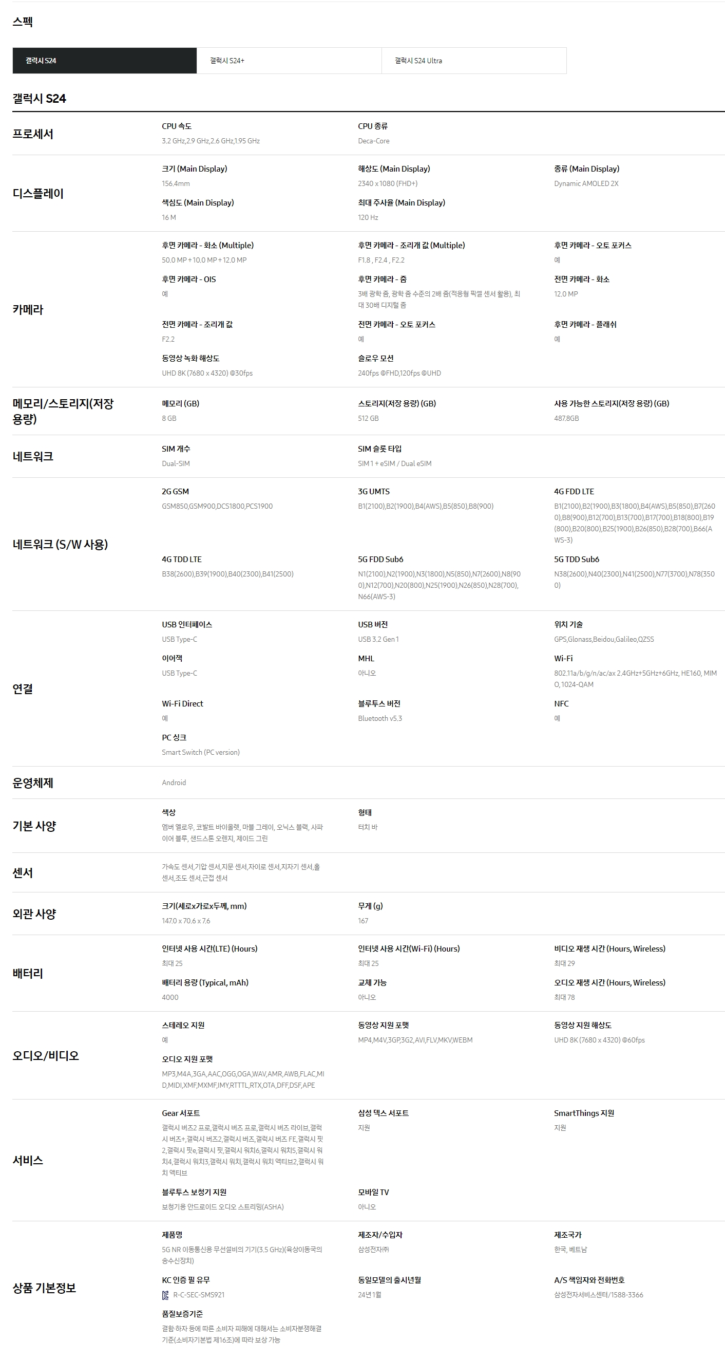 삼성 홈페이지에서 제공하는 S24 스펙을 마지막으로 이만.