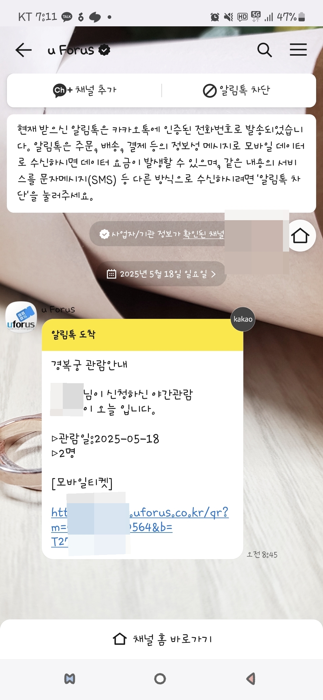 당일 아침 되면 모바일 티켓을 카톡으로 보내준다.