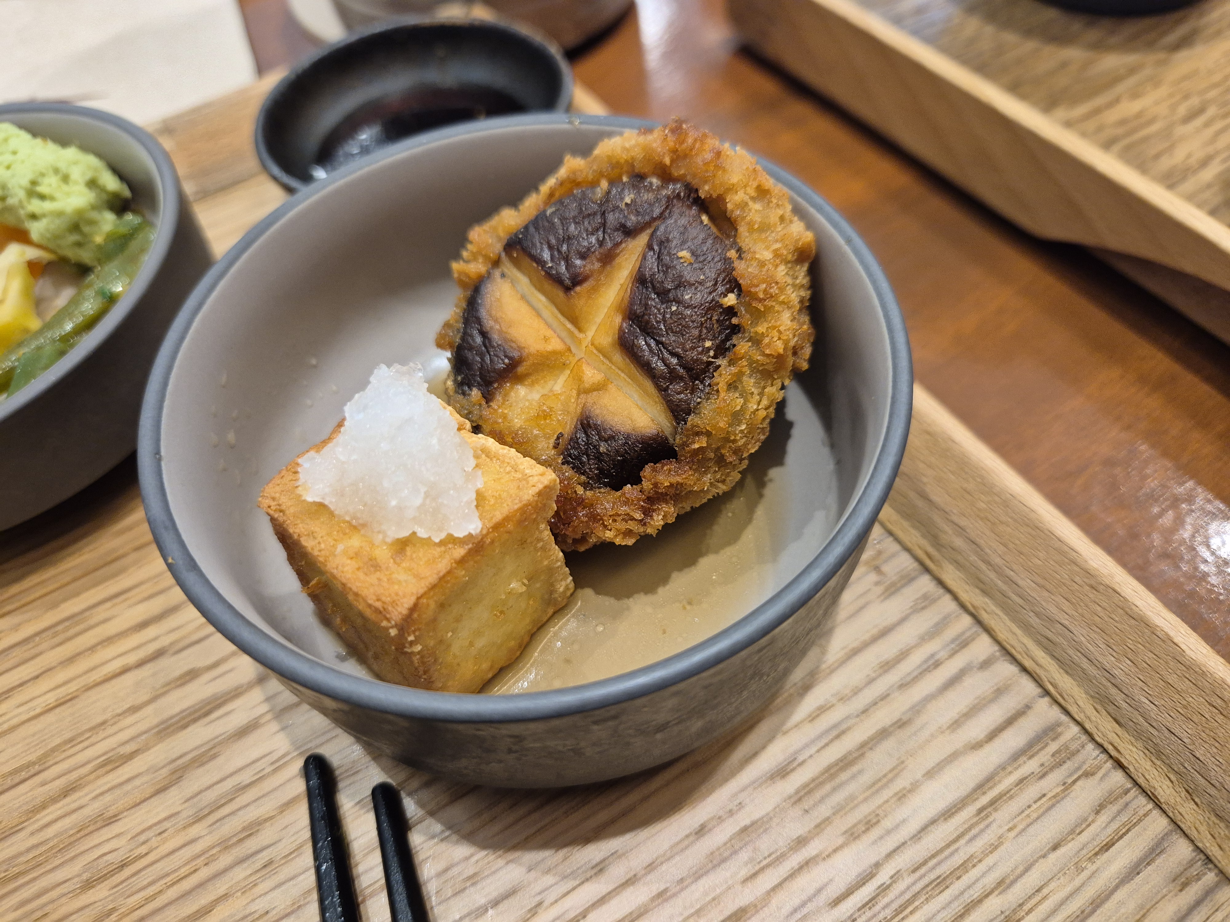 밥을 어느정도 먹으면 반찬(?)으로 두부와 버섯 튀김을 줍니다.