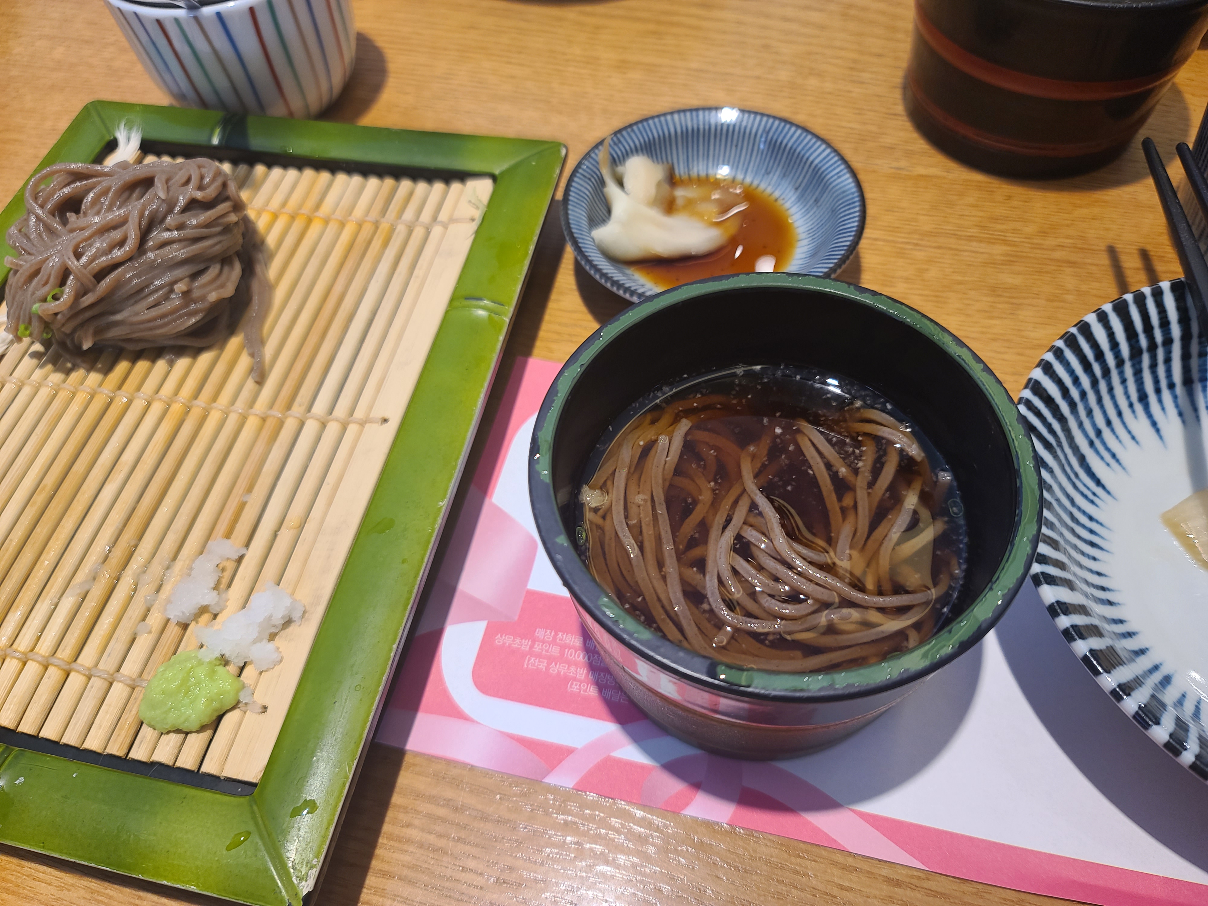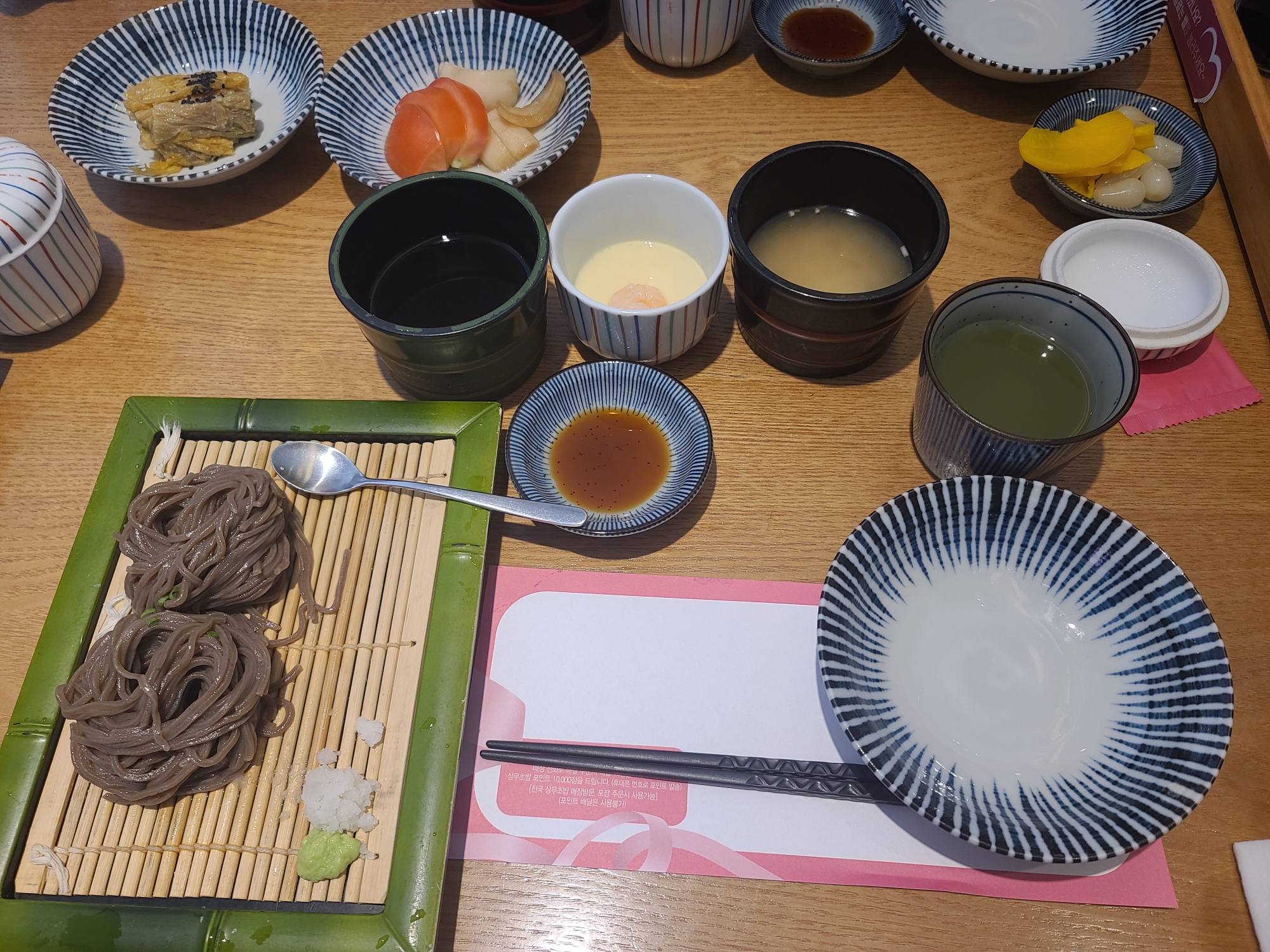 밥솥에서 바로 꺼낸 부드럽고 짭쪼름한 계란찜으로 입맛을 돋구고 판모밀을 쯔유에 적신다.