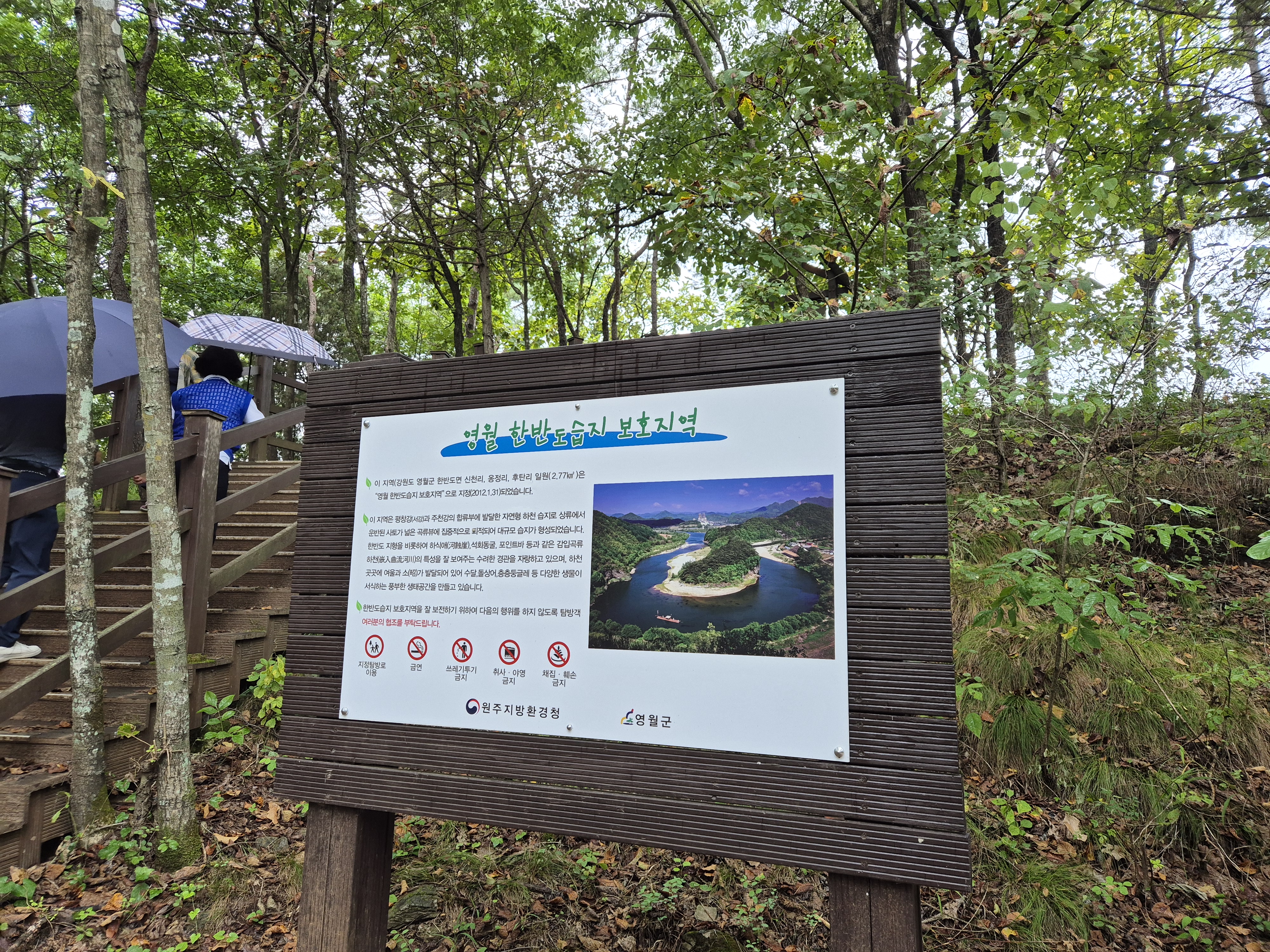 10~20분 정도? 올라가면 영원 한반도습지 보호지역 팻말이 나오고, 여기가 한반도지형 포토존이다.