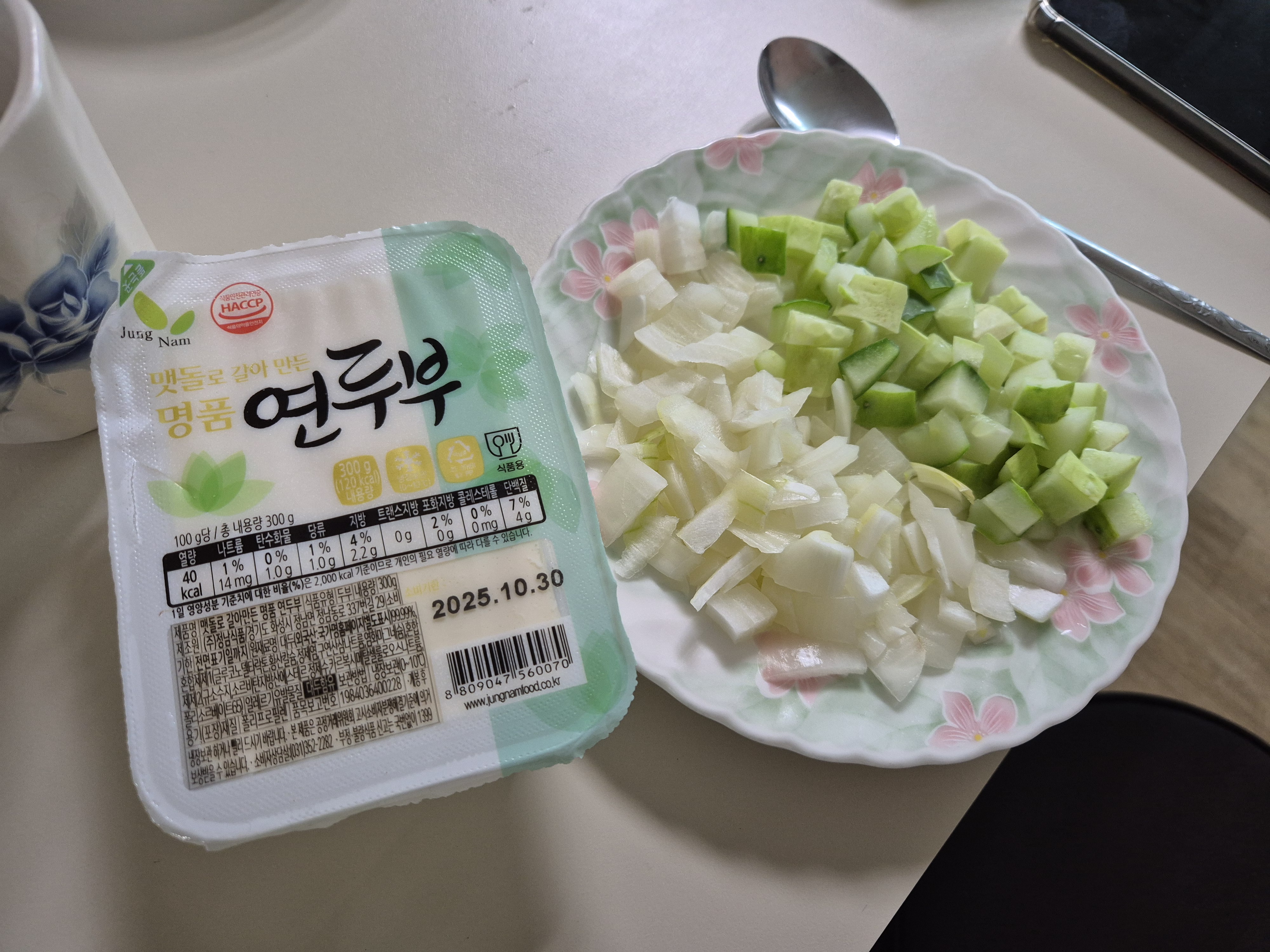 뭔가 씹어먹는게 먹고 싶어서 허용식품인 두부, 양파, 오이로 점심을 꾸려봤다.