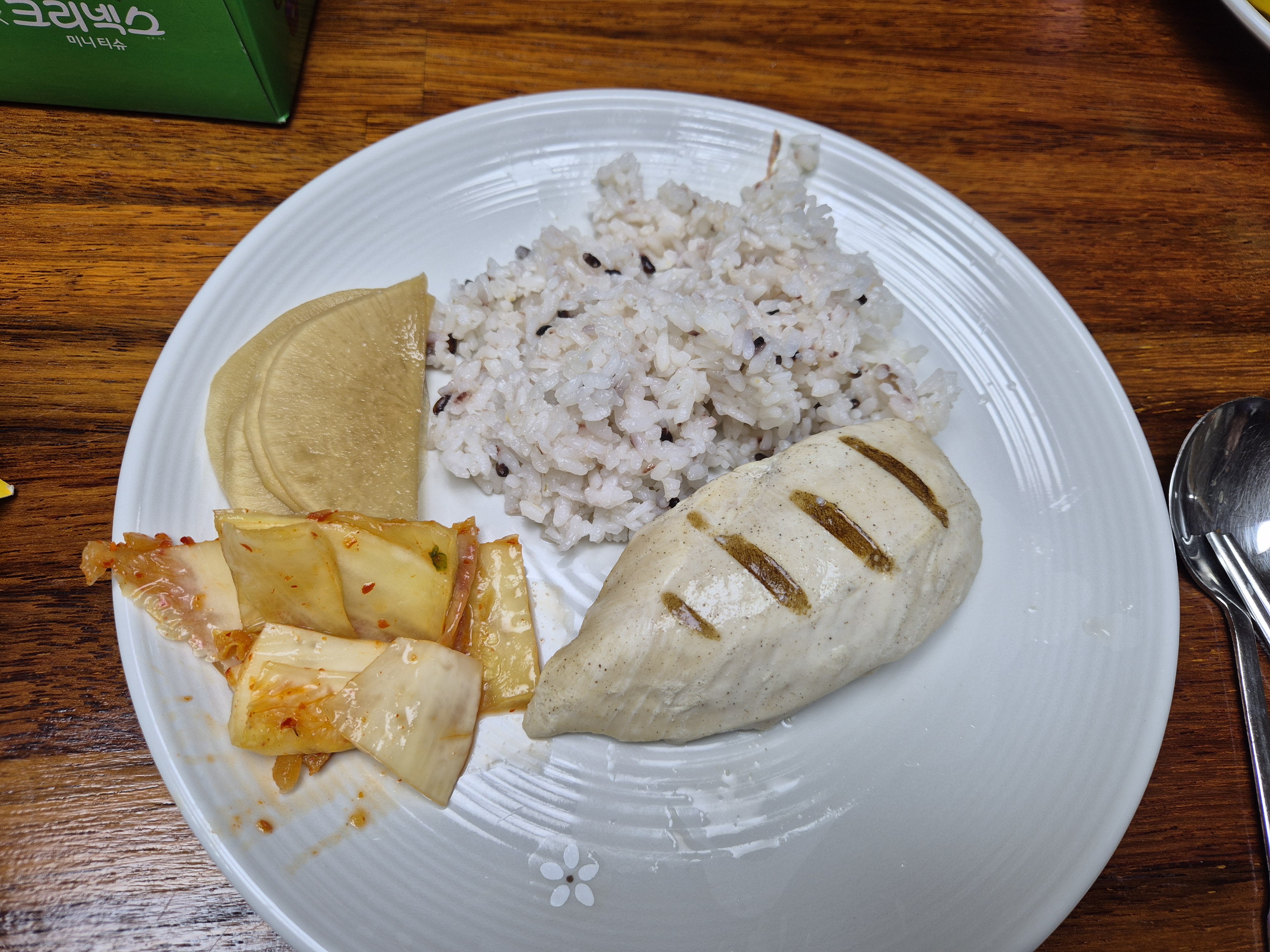 대신 닭가슴살을 싸가서 쌀만 얻어먹었다.