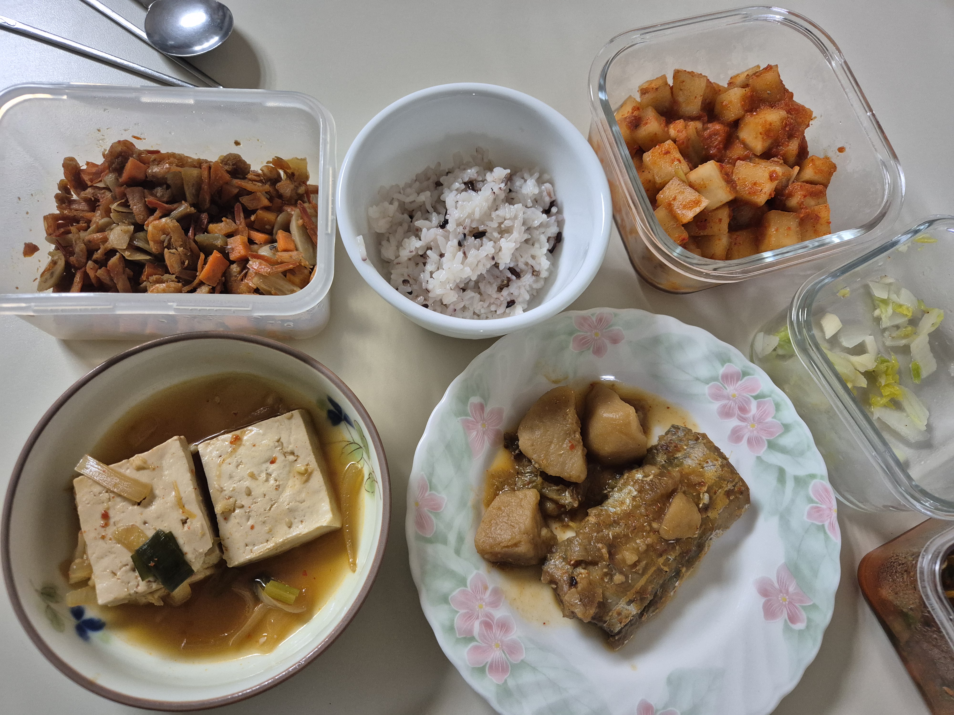 갈치조림에 두부조림 그리고 김치랑 나물.