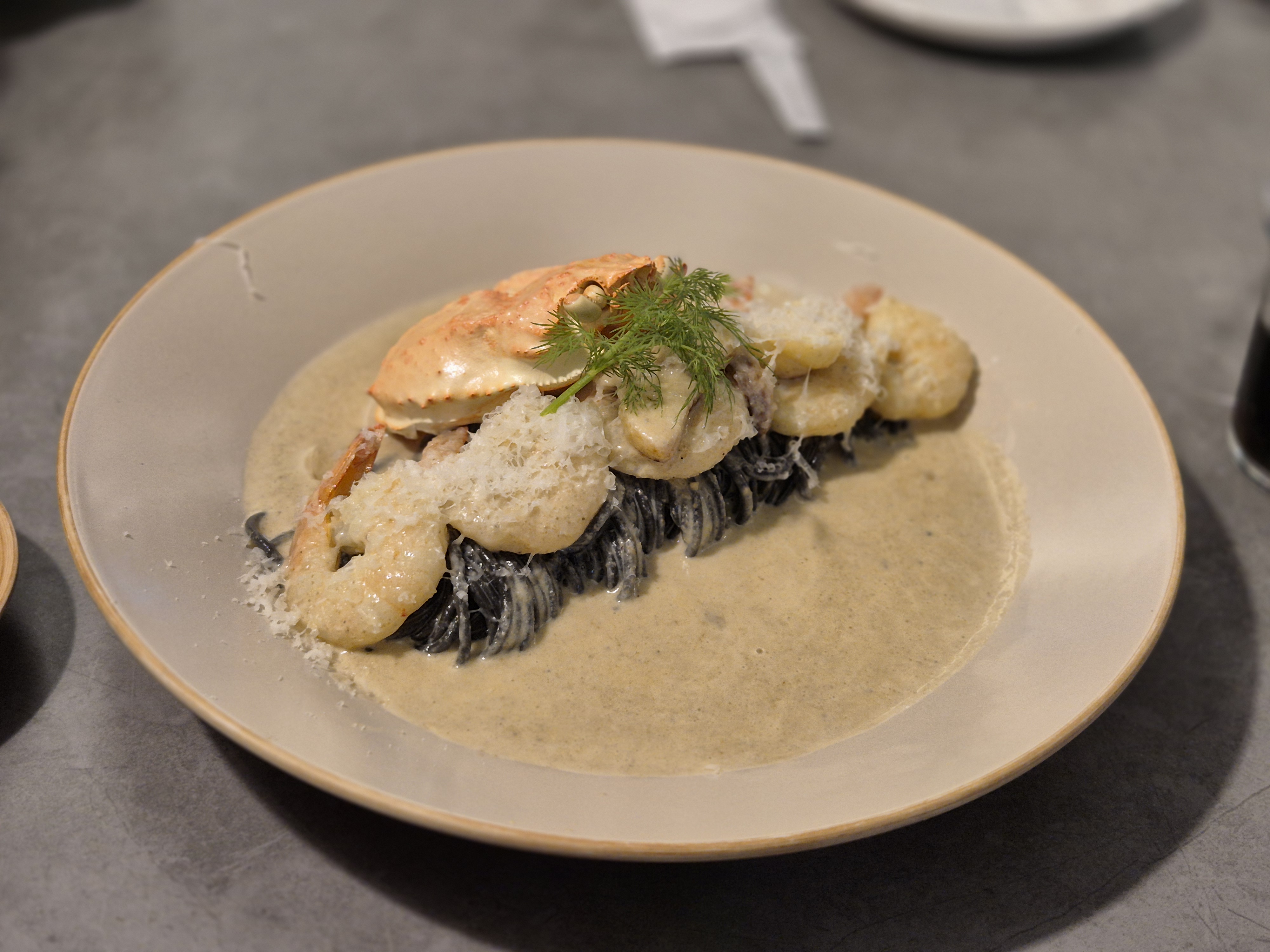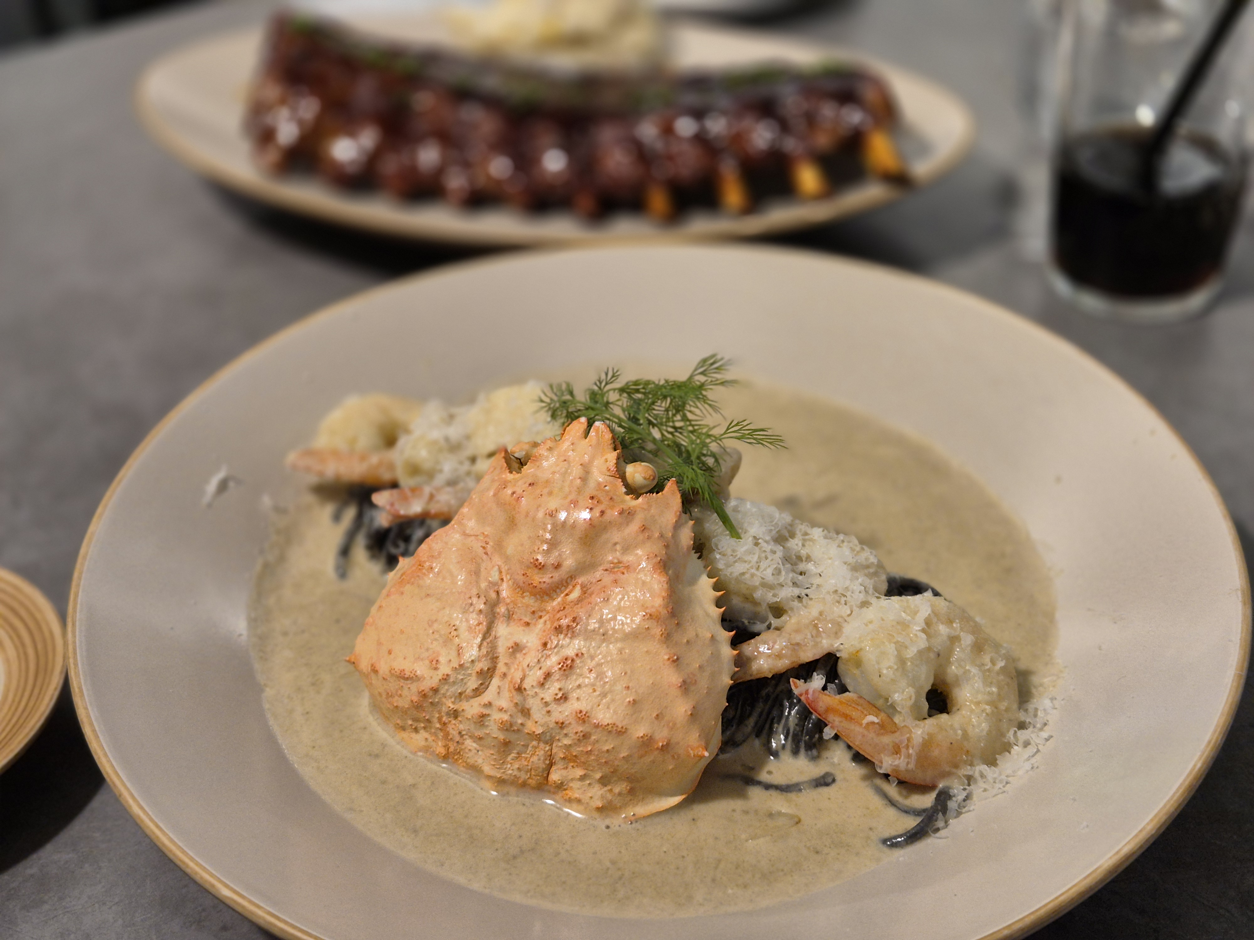 대게 한마리가 파스타를 감싸고 앉아있다.