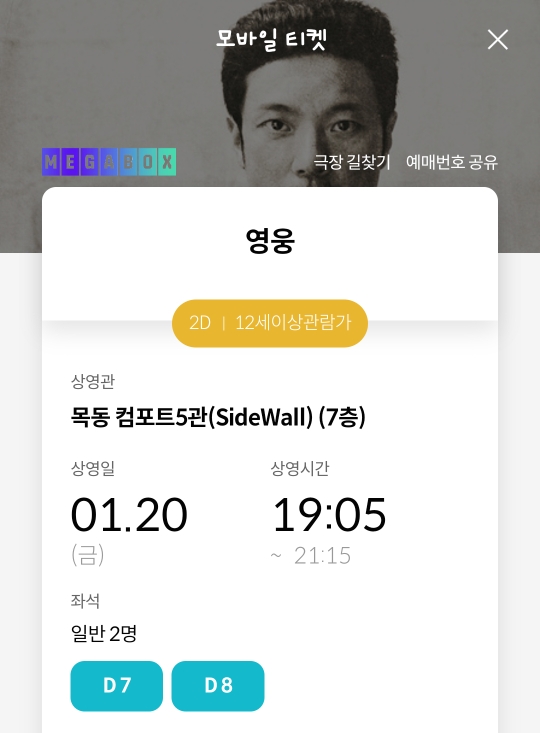 우리가 관람한 관은 메가박스 목동관중에 가장 작은관이었는데, B님이 나중에 합류해서 따로 앉아야되나 했는데 옆자리 분이 바꿔주셔서 다행히(?) 나란히 앉았다. 1월 20일에 예매할때도 미리 영웅 스케줄을 풀어주지 않아서 기다렸다가 예매를 했는데, 재관람을 하려고 다시 찾아볼때도 역시나 스케줄이 나와있지 않았다. 그나마 나온 시간대는 전부 낮시간 ㅠ. 어째서 이렇게 작은 관에 시간도 애매하게 편성되어 있는지 내가 분했다.